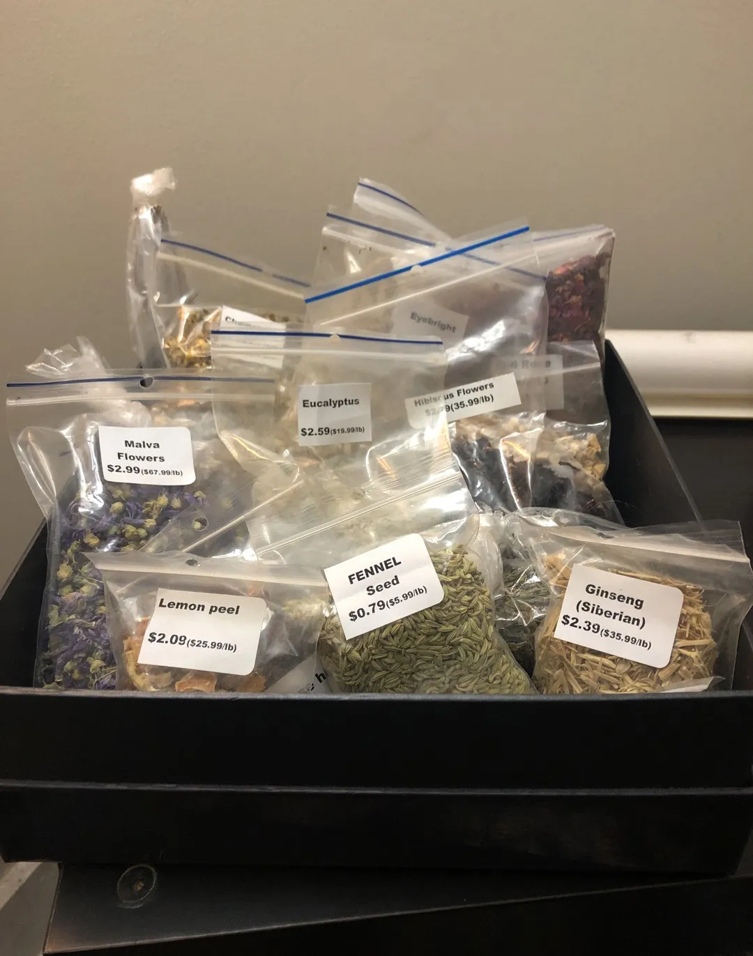 Lemon Peel Fennel seed Ginseng Sencha Rooibos Malvasia flowers Eucalyptus Rose hip Hibiscus flowers Elderberry Eyebright Astragalus root Liquorice root Marshmallow root Star anise Red rose petals