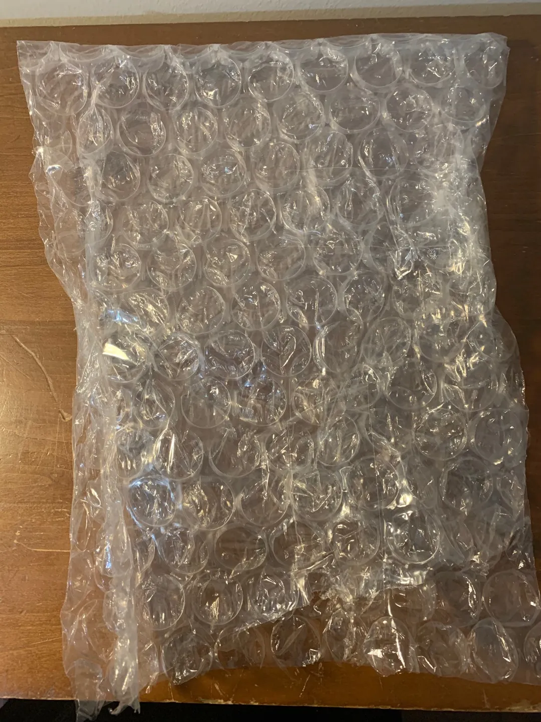 Sheets of large and small bubble wrap plus soft packing chips to protect goods in transit.