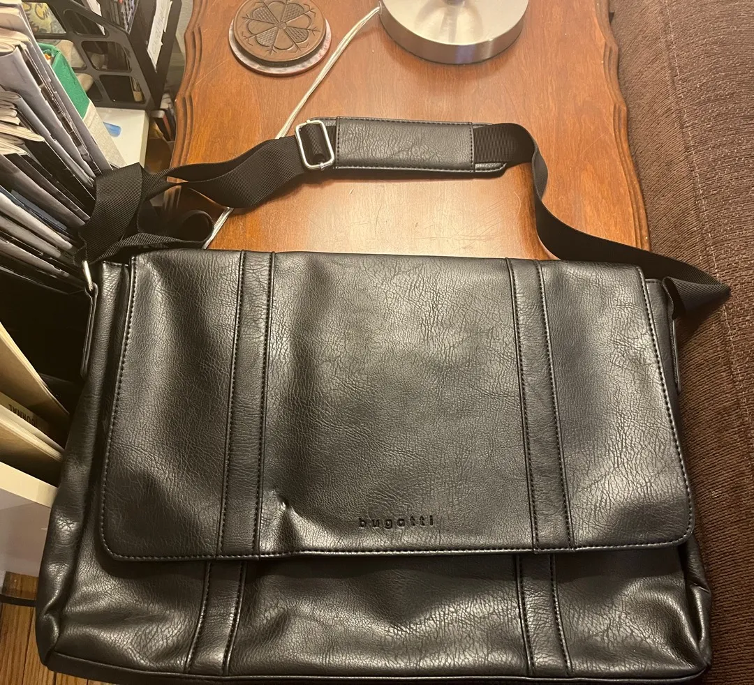 Excellent condition except for an indent on the front - see additional photos for detail. About 17” long. 2 compartments inside with lots of little subpockets and one extra snap pocket on the back. Nylon lining, I think!