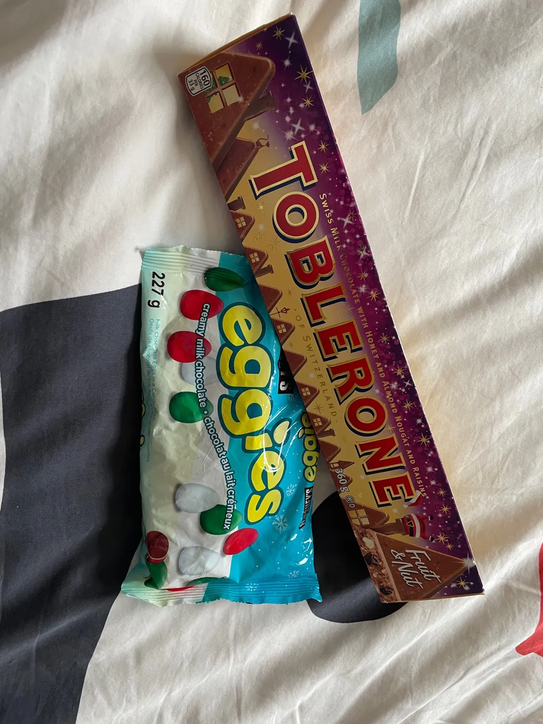 Fruit & Nut toblerone and a bag of mini eggs. Unopened, I just don’t like these very much.