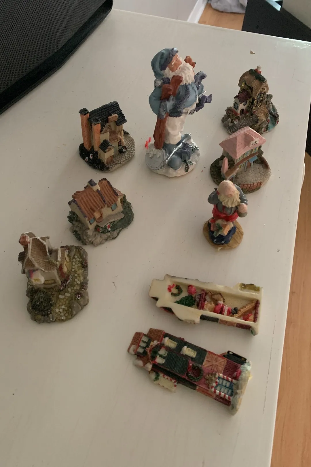 Little Santa is 3” tall. Bigger Santa is 5” tall. These are not ornaments, meant to go under the tree as a Christmas village