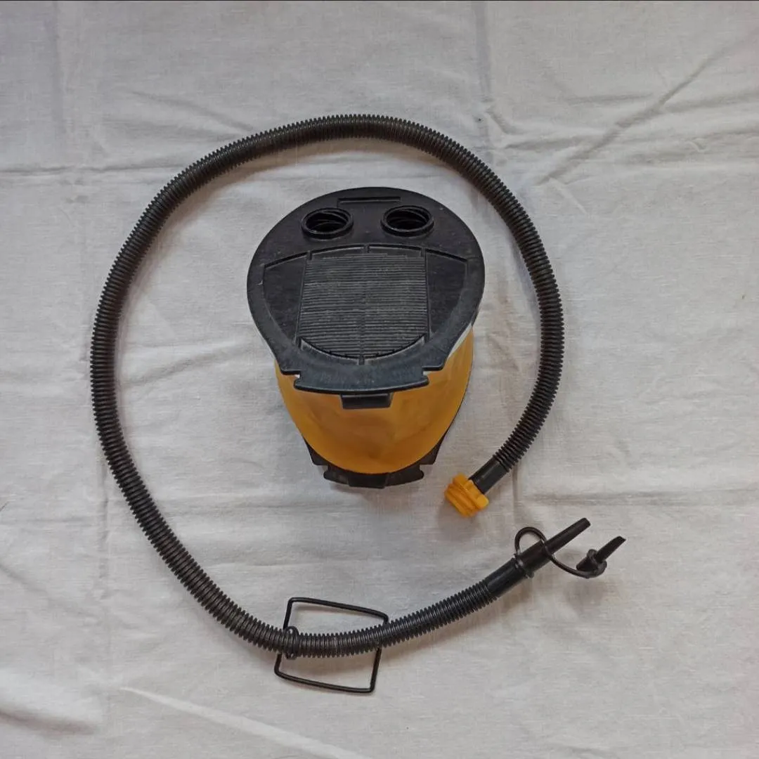 Inflador manual de pie perfectamente funcional con dos boquillas y modo de inflado y desinflado.
