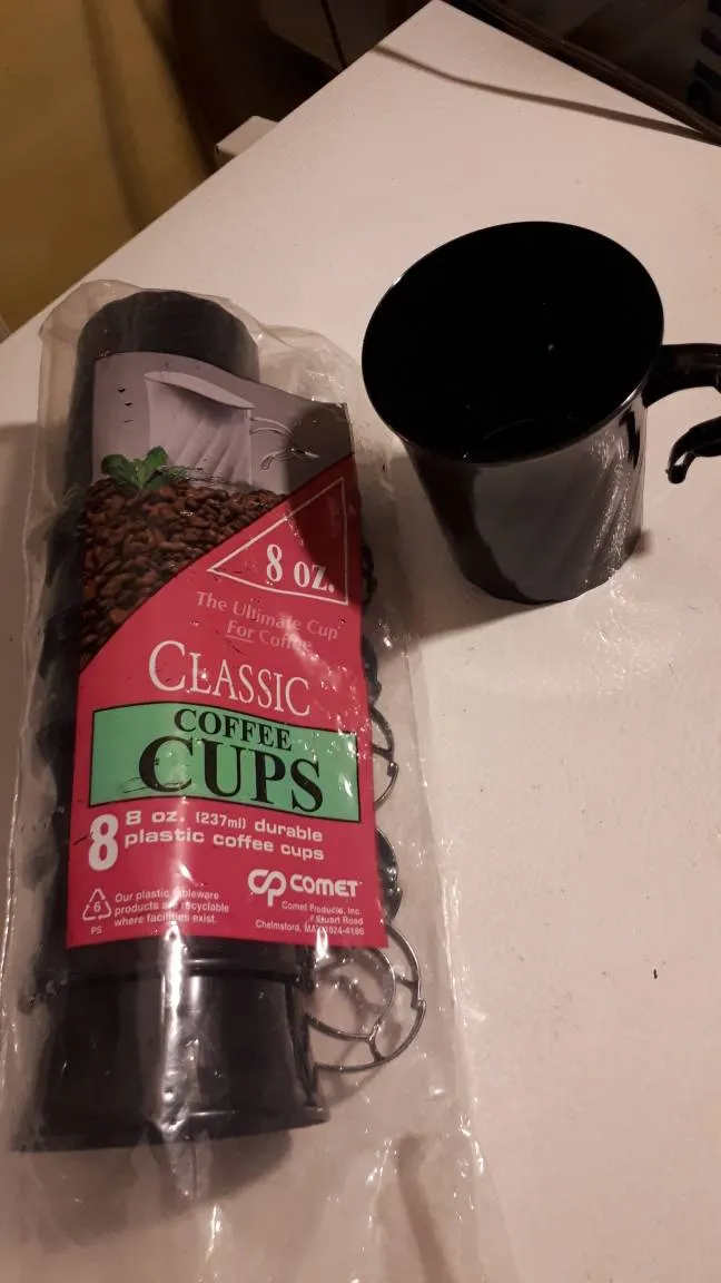 7 plastic coffee cups, 8 oz, bag had 8 as you can see, used one, never got to them again...