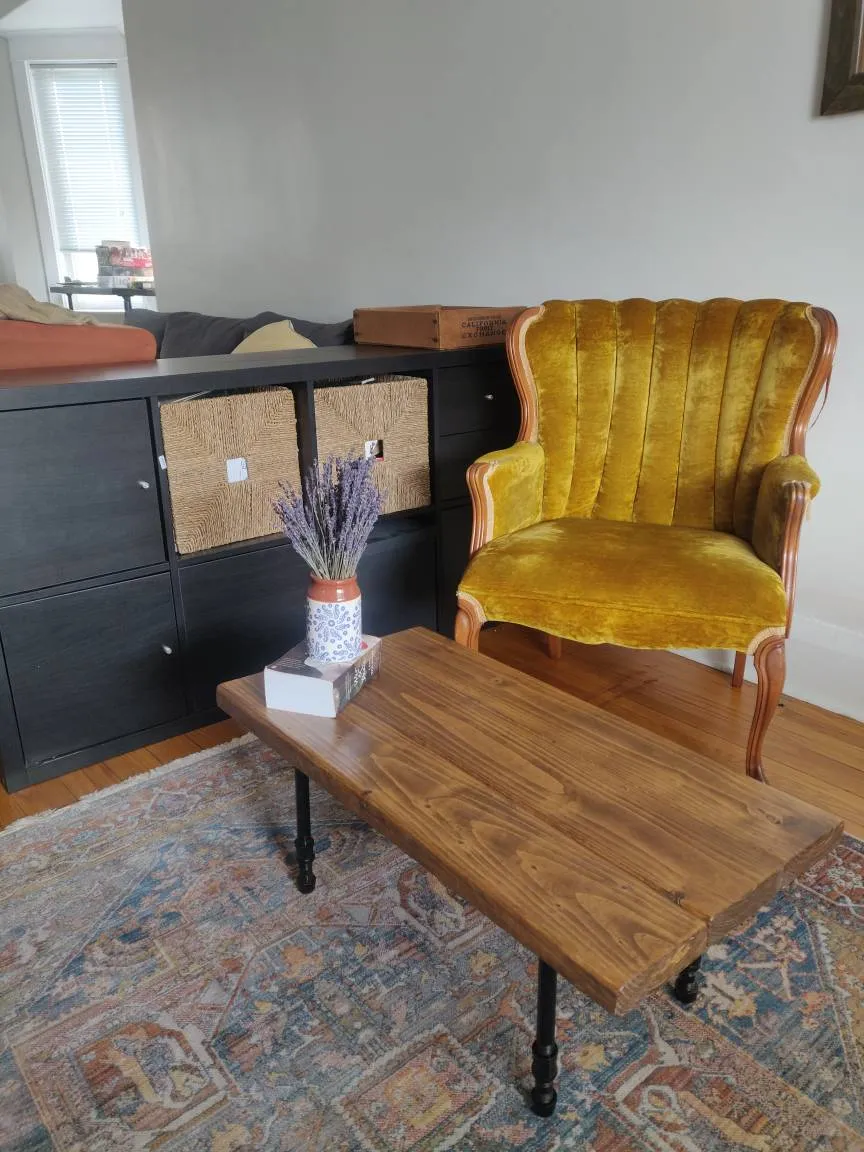 I made this rustic, solid wood panel coffee table by hand, 100% sourced and built locally in Toronto. It's made from reclaimed spruce, stained early American, sealed with polyurethane and attached to gloss black painted Iron Legs. 32"X16.5"x13.5" Small Hole In The Surface. Located Near Rodgers And Caledonia. Valued At 180