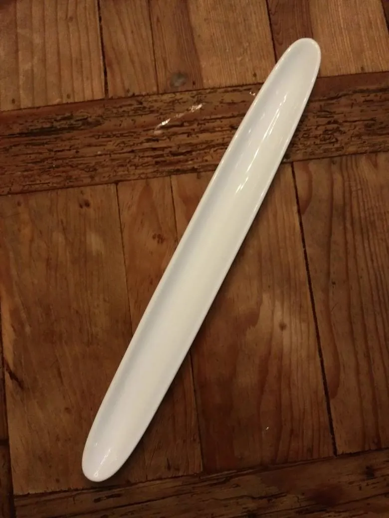 Long narrow serving vessel. 16" long, 1 1/2" at widest halfway point. Can be used for serving olives, nuts, etc.