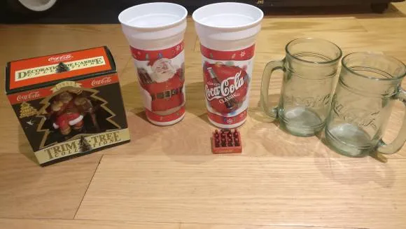 Santa Claus xmas ornament Coca cola magnet 2x plastic coca beverage cups 2x glass Toronto Maple Leafs Maple Leaf Gardens commemorative bottles 2x coca cola glass mugs