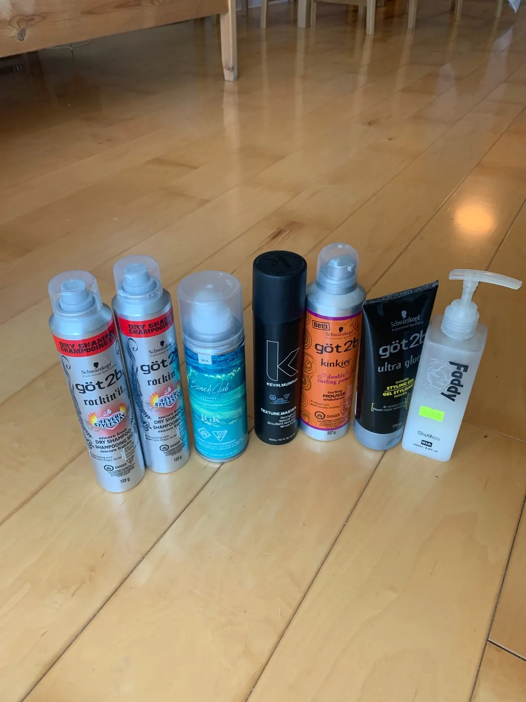 (Left to right) Got2b dry shampoo: 1 full bottle; 1 half bottle (both traded) Beach club texture spray: 15% left Kevin murphy texture master: 70% left but wonky nozzle doesnt spray evenly Got2b curling mousse: 50% left Got2b styling gel: new unused Faddy waxy cream: 50% left