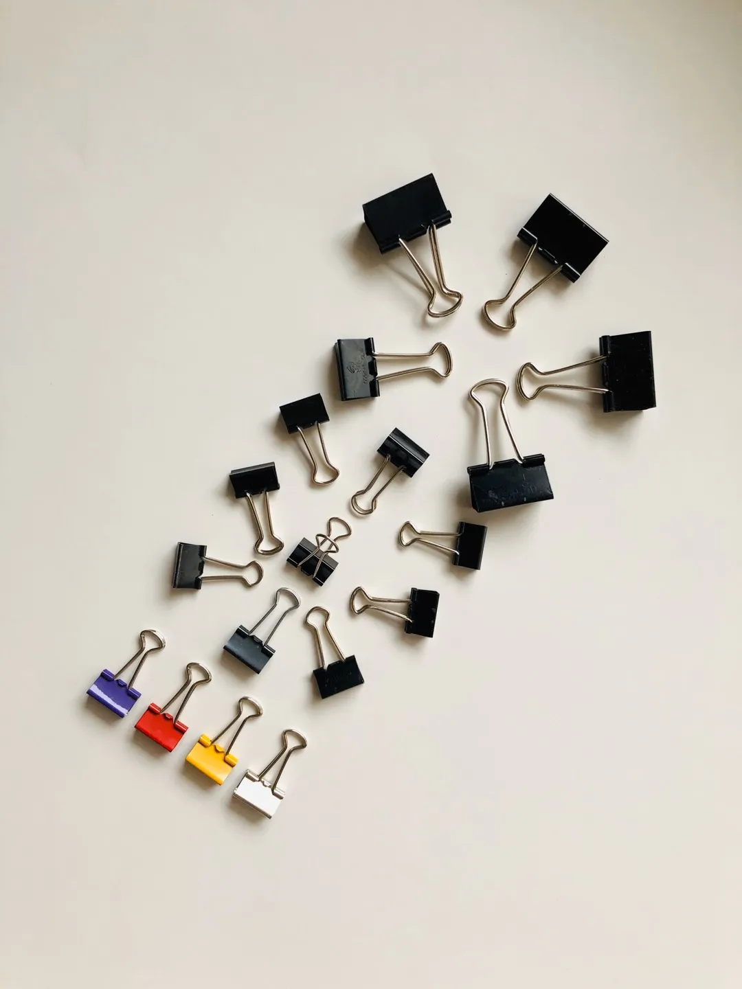Metal binder clips in three different sizes. Mainly black, but also 1 x blue, 1 x red, 1 x yellow, and 1 x silver.