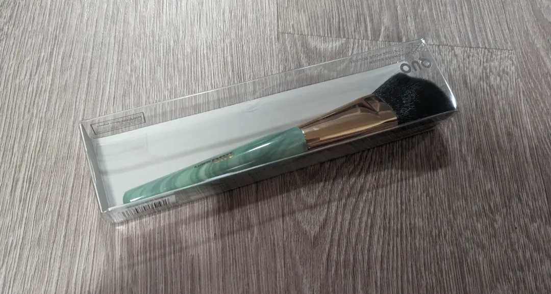 A contour brush. Features a green marble handle. The brush head is black. This brush could be used to gently apply your favourite makeup products for a polished look.