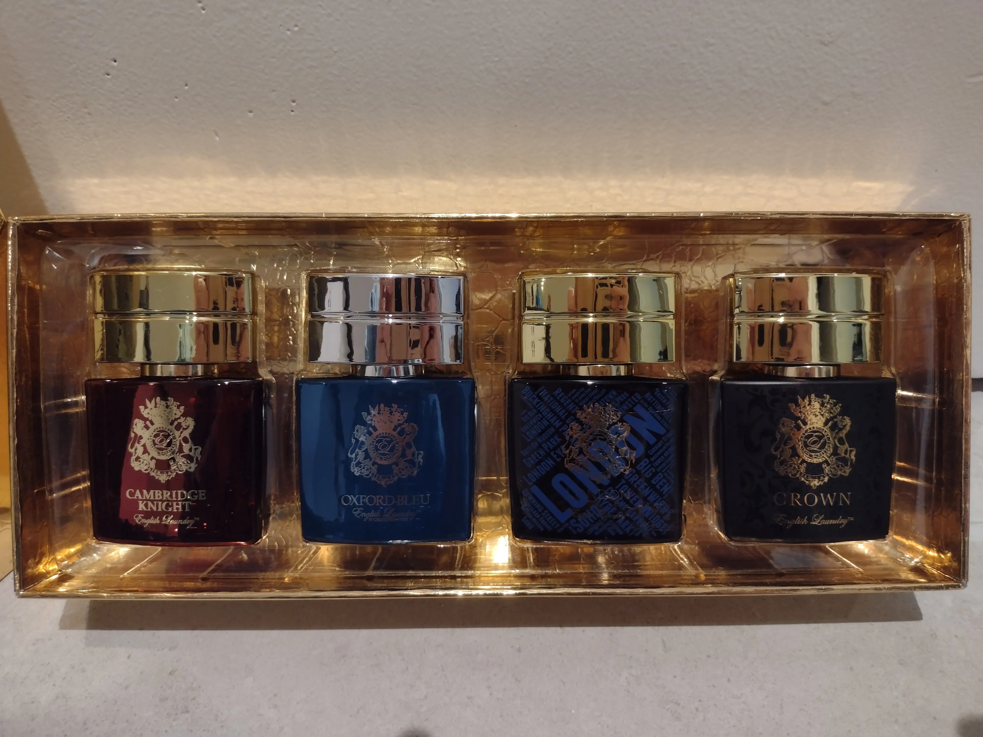 Four miniature colognes in a gold gift box. Includes Cambridge, Oxford Bleu, London, and Crown fragrances. New, never used.