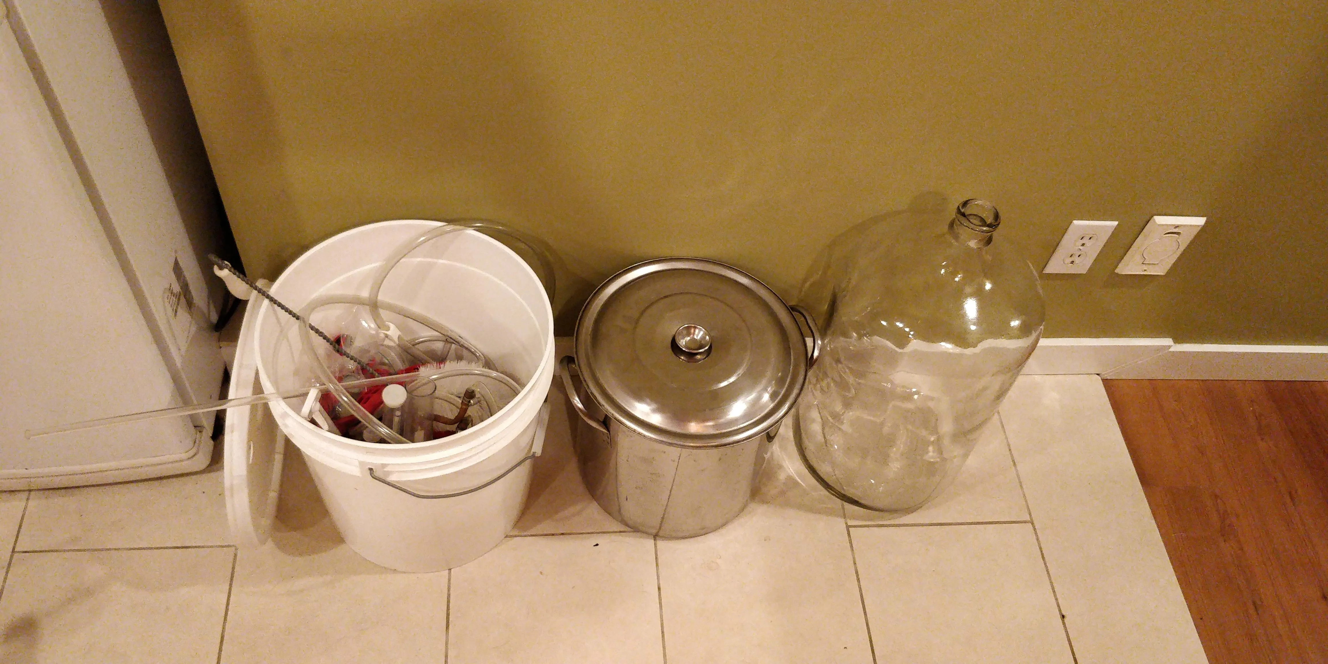 Two carboys, one primary fermenter buckets, one large pot, strainer basket, copper coils, cleaning equipment, bottling equipment, sugar for bottling, and TONS of bottles. Basically, everything you need to brew your own beer, just pick up the ingredients!