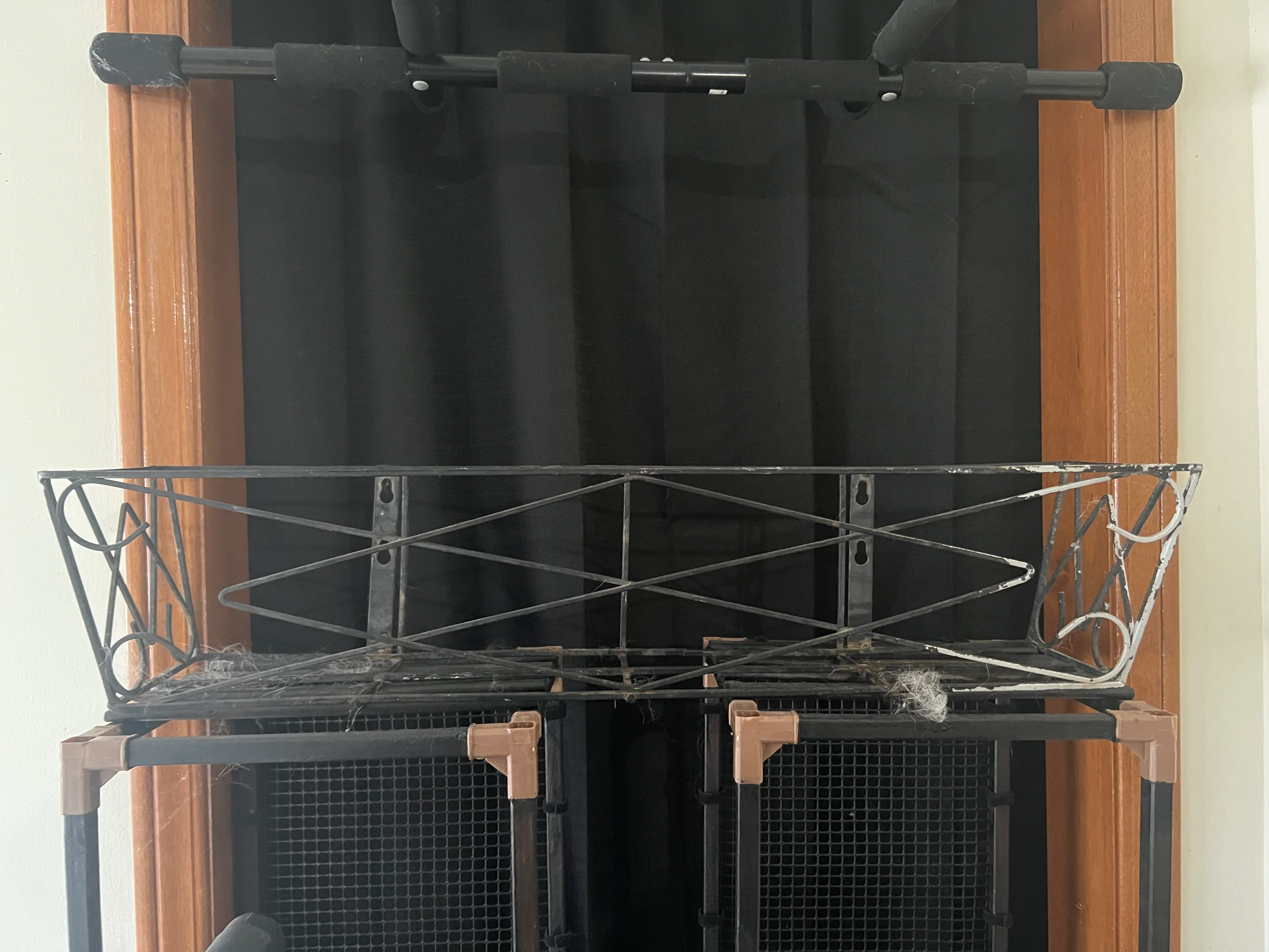 Black metal shelf with ornate details. Good condition, comes from pet friendly home. Could use a fresh coat of spray paint, but overall sturdy