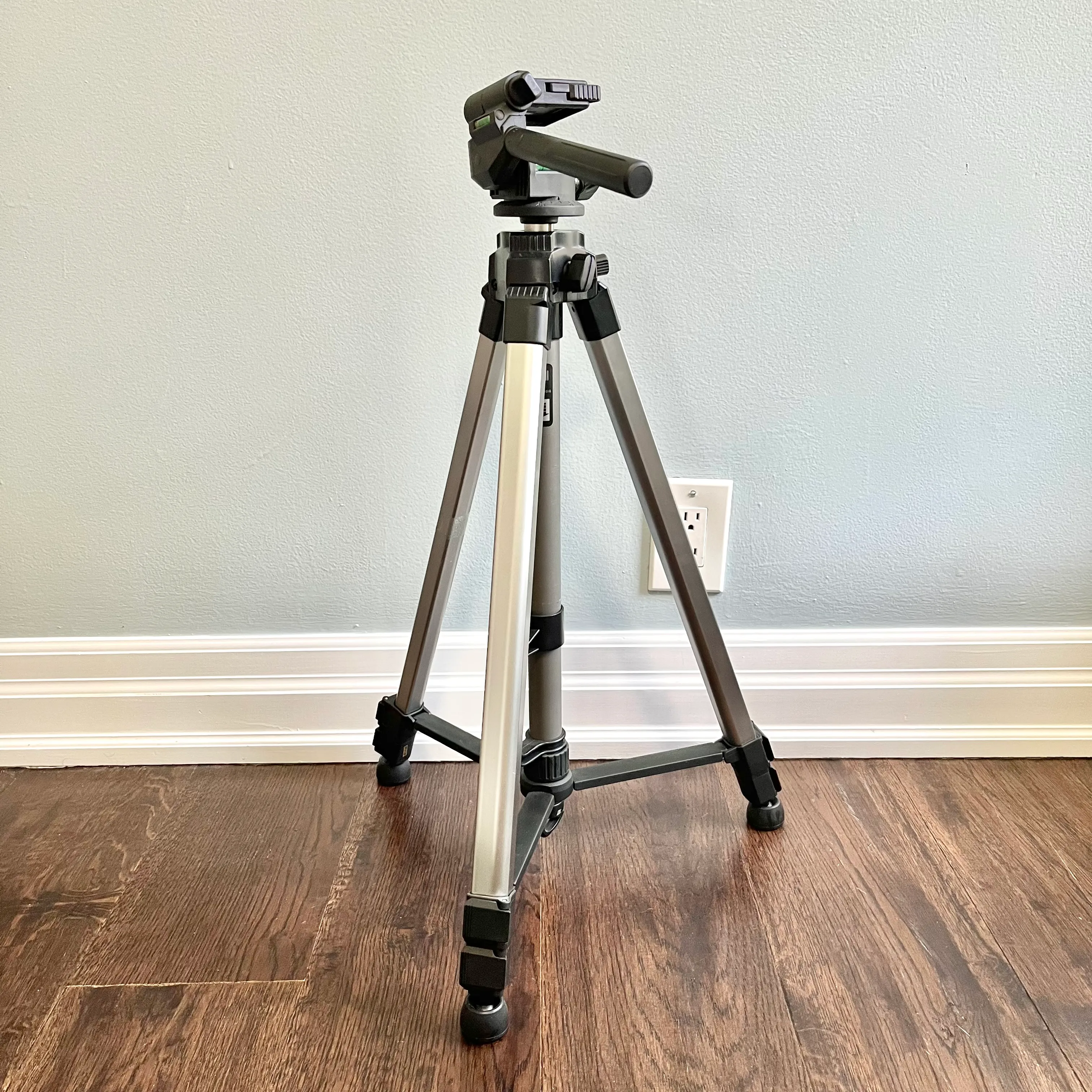 Giotos VT809 camera tripod. Good working condition. There was a small chip on one of the bolt handles as seen in third picture, it still works well but has been modified.