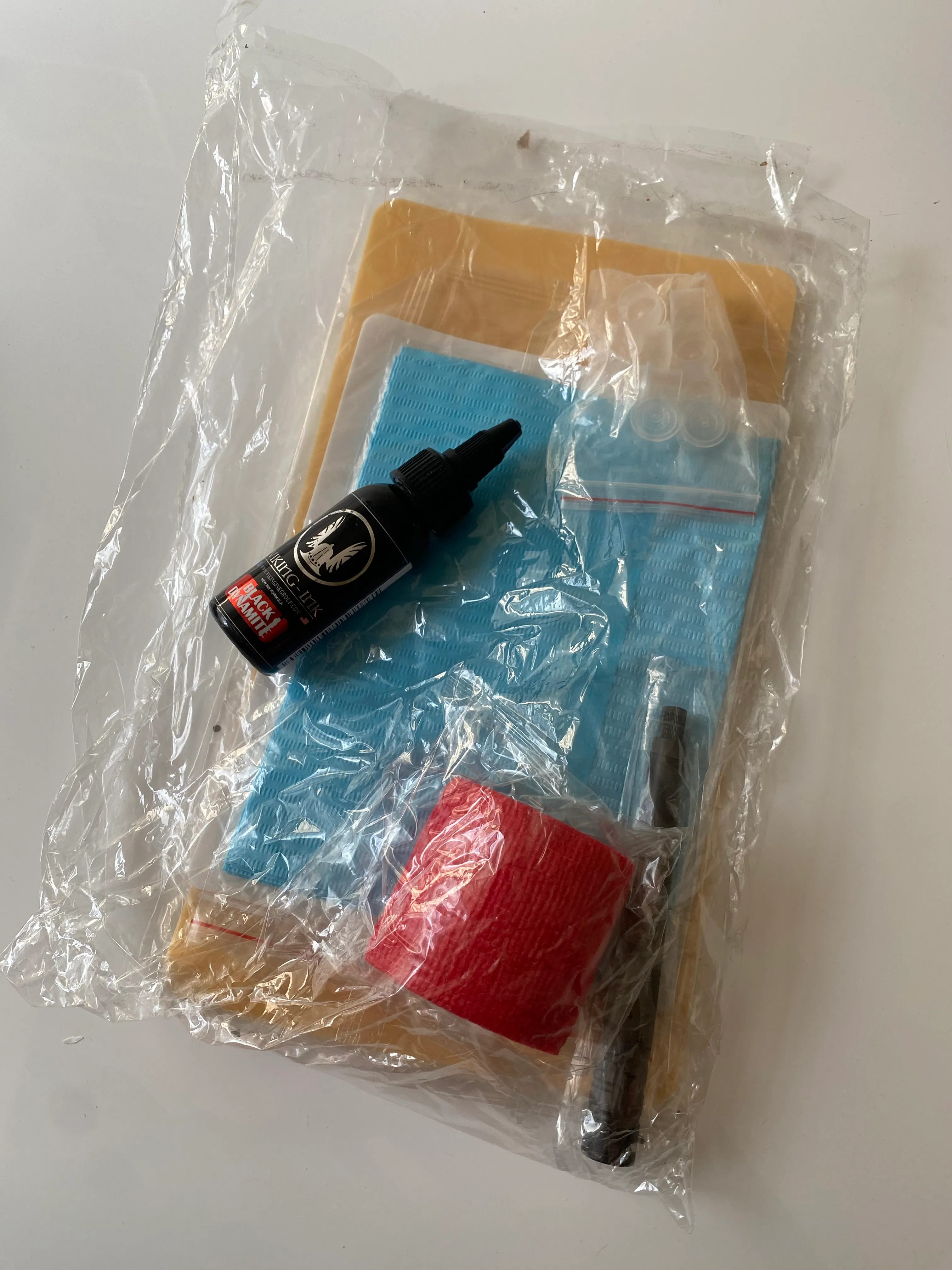 New tattooing kit (originally bought on Amazon) has practice skin, and a hand poking pen, ink.