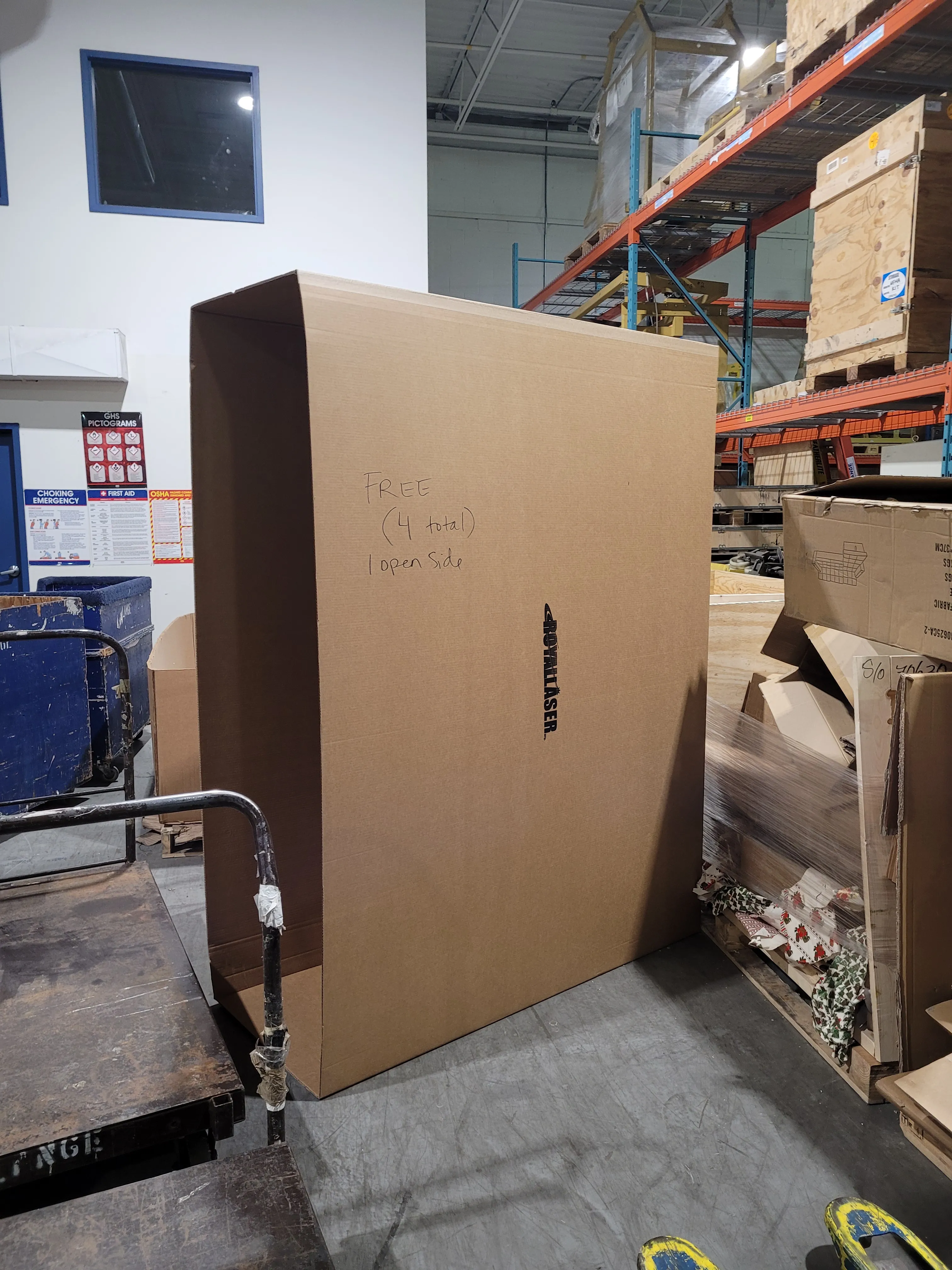 4 Very large 5 sided boxes. Taller then me. Good clean cardboard. Free. First come first serve 391 attwell drive. Its in storage and i can meet you there daytime weekdays. That means Monday to Friday 8am to 430pm. No holds. No delivery.