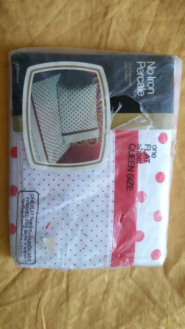Red polka dotted queen sized sheet. Never open, hole in wrapping though, 50% polyester, 50% cotton