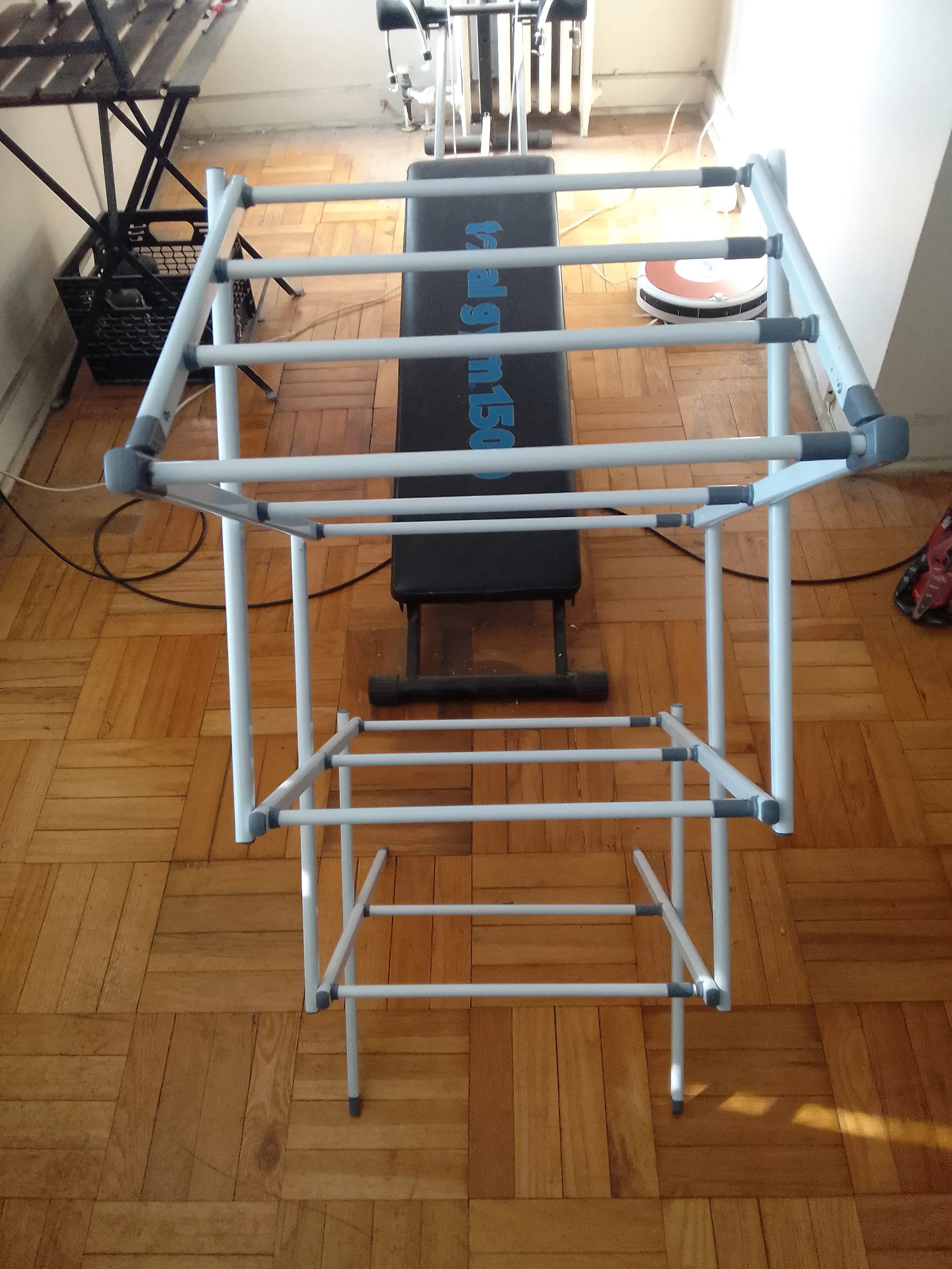In like new condition. Clothes Drying Rack, 3-Tier Expandable and Collapsible Metal, Air Drying Rack, White. H - 40", W - 15", Short L - 17", Fully Extended L - 29";