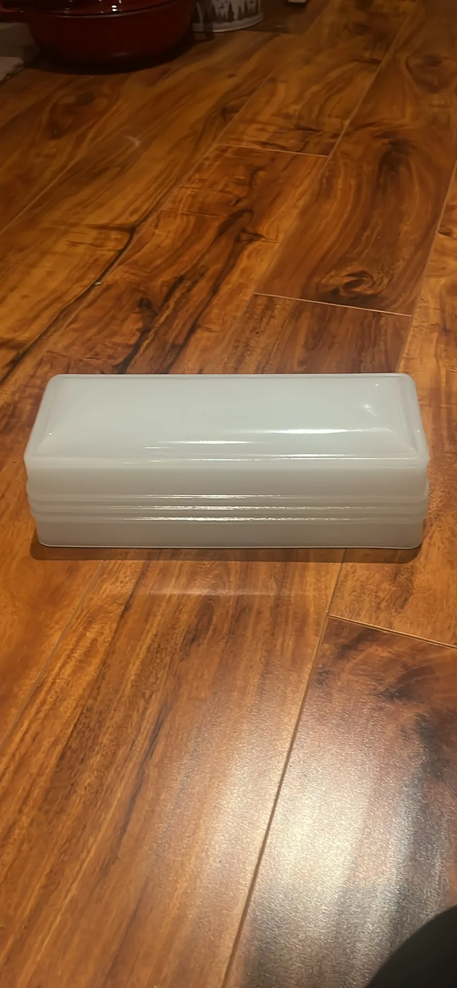 Made of heavy milk glass. About 11” wide and 4” deep. No scratches or chips