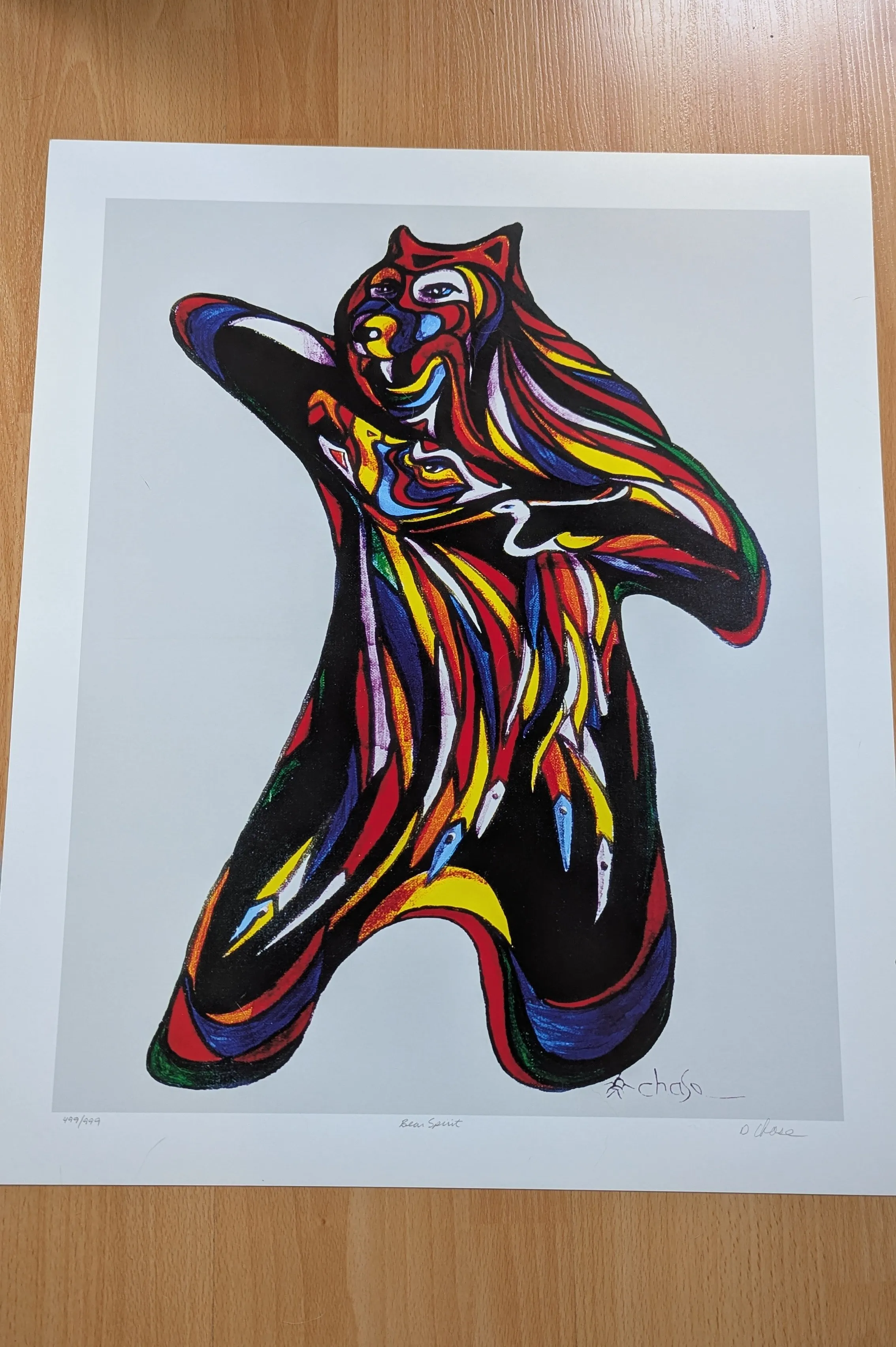 A vibrant print on paper, featuring a bear-like figure. The figure is composed of many colours on a black base. Signed at the bottom of the print. Imagine having this artwork hang on your wall to brighten up any space.