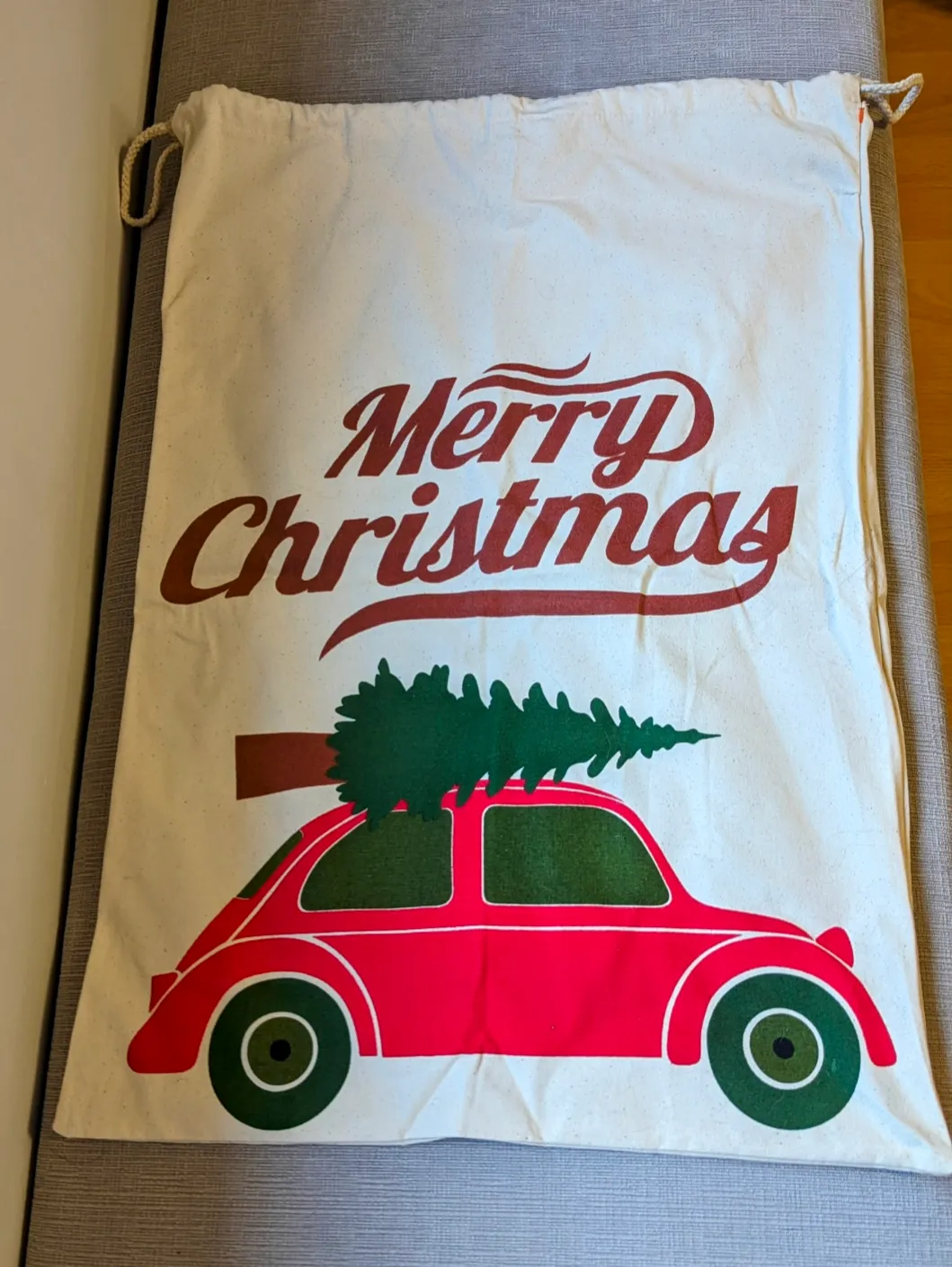 Trading a festive Christmas drawstring bag! It features a cute design with a red car carrying a Christmas tree. Perfect for storing gifts or decorations this holiday season.