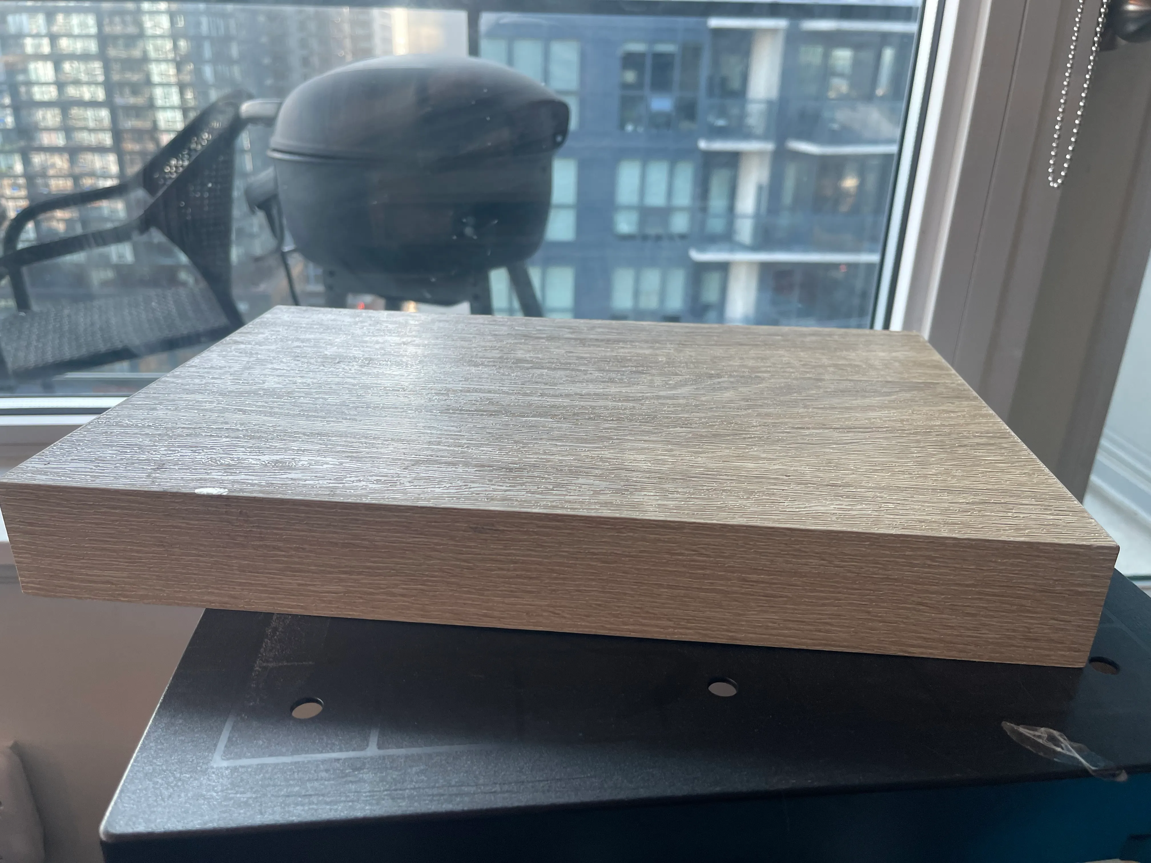 A wooden floating shelf. Has a steel frame that you screw to the wall and slide the shelf on.