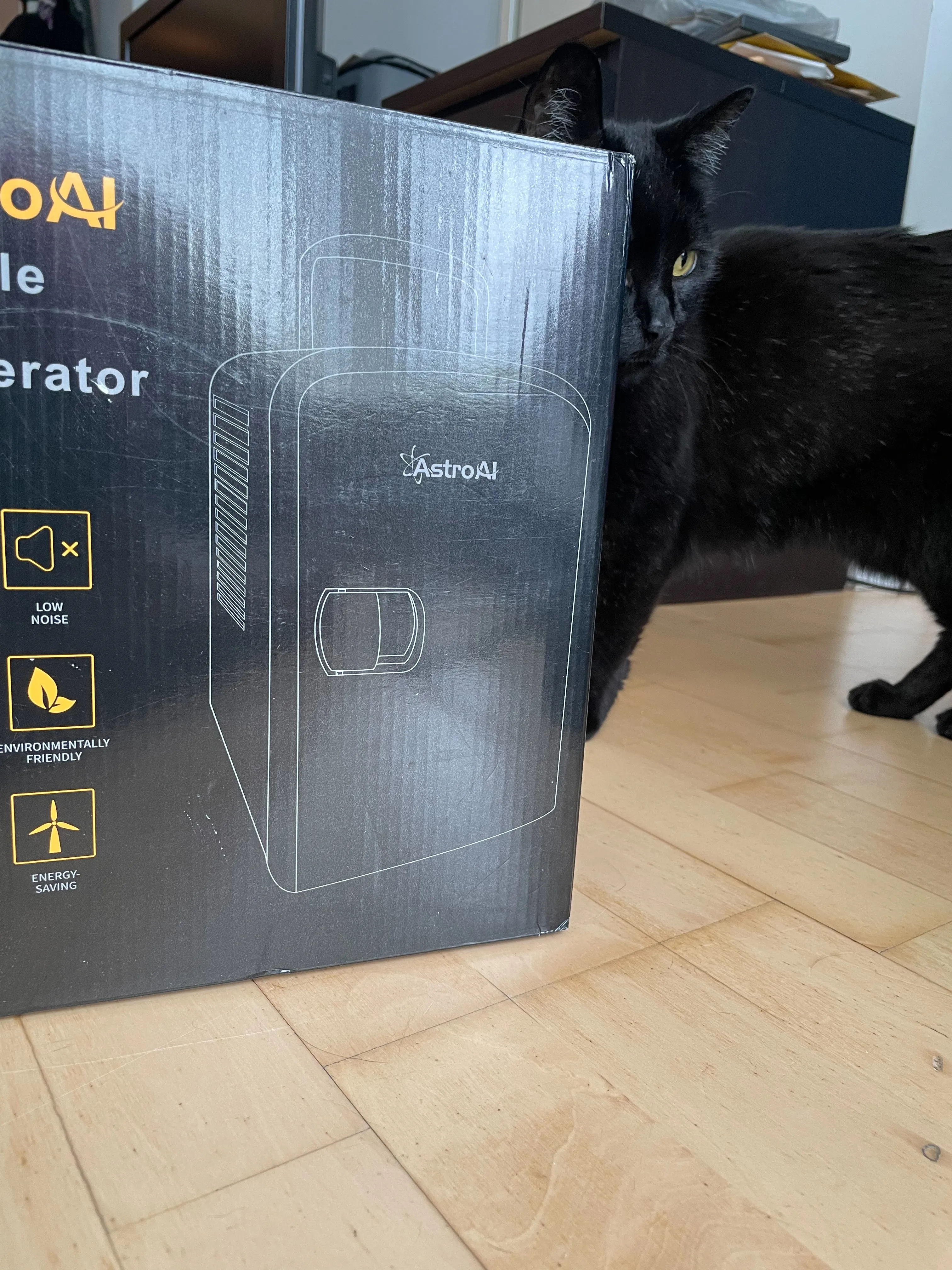 AstroAI mini fridge. Also has warming function. Works great! Used for 3 months during training - no longer need. Cat for size.