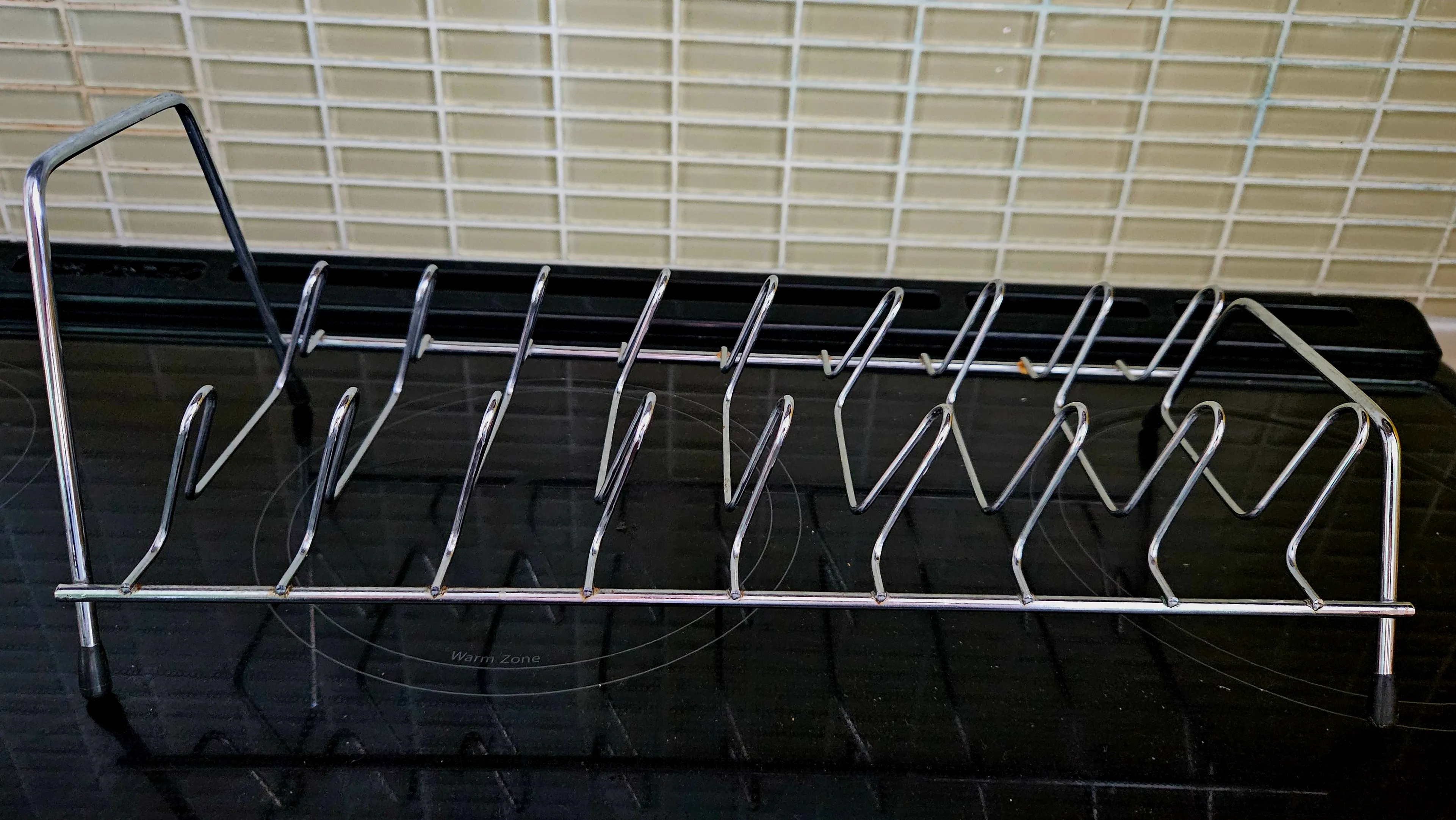 Here's a chrome dish drying rack, perfect for keeping your dishes organized after washing. It's in great shape and ready to use in your kitchen.