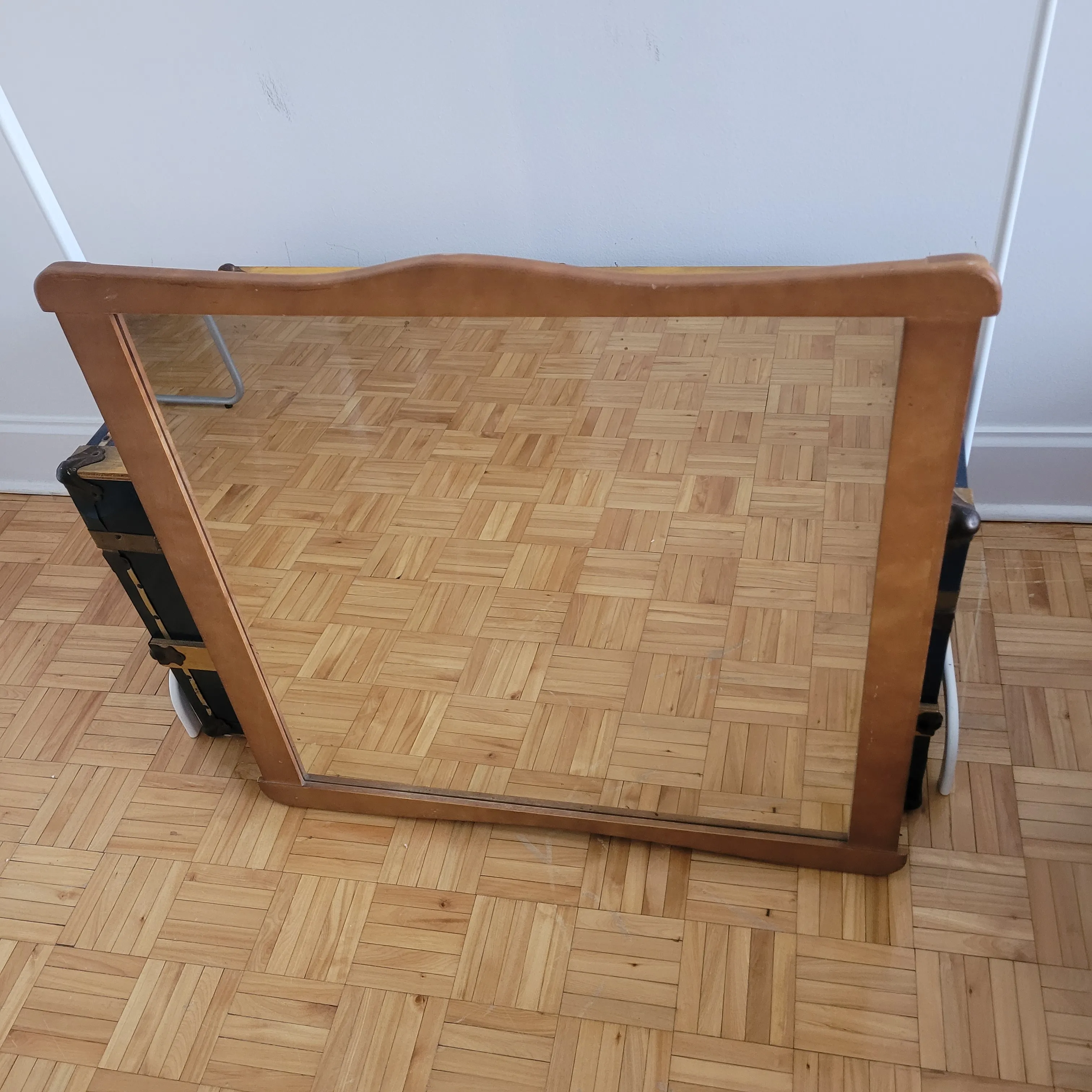 Very good vintage condition. Some nicks on frame and spot on glass (see pictures). Has 2 wood blocks on the back to keep it off of the wall but those could be removed. Some water damage on back. HEAVY.