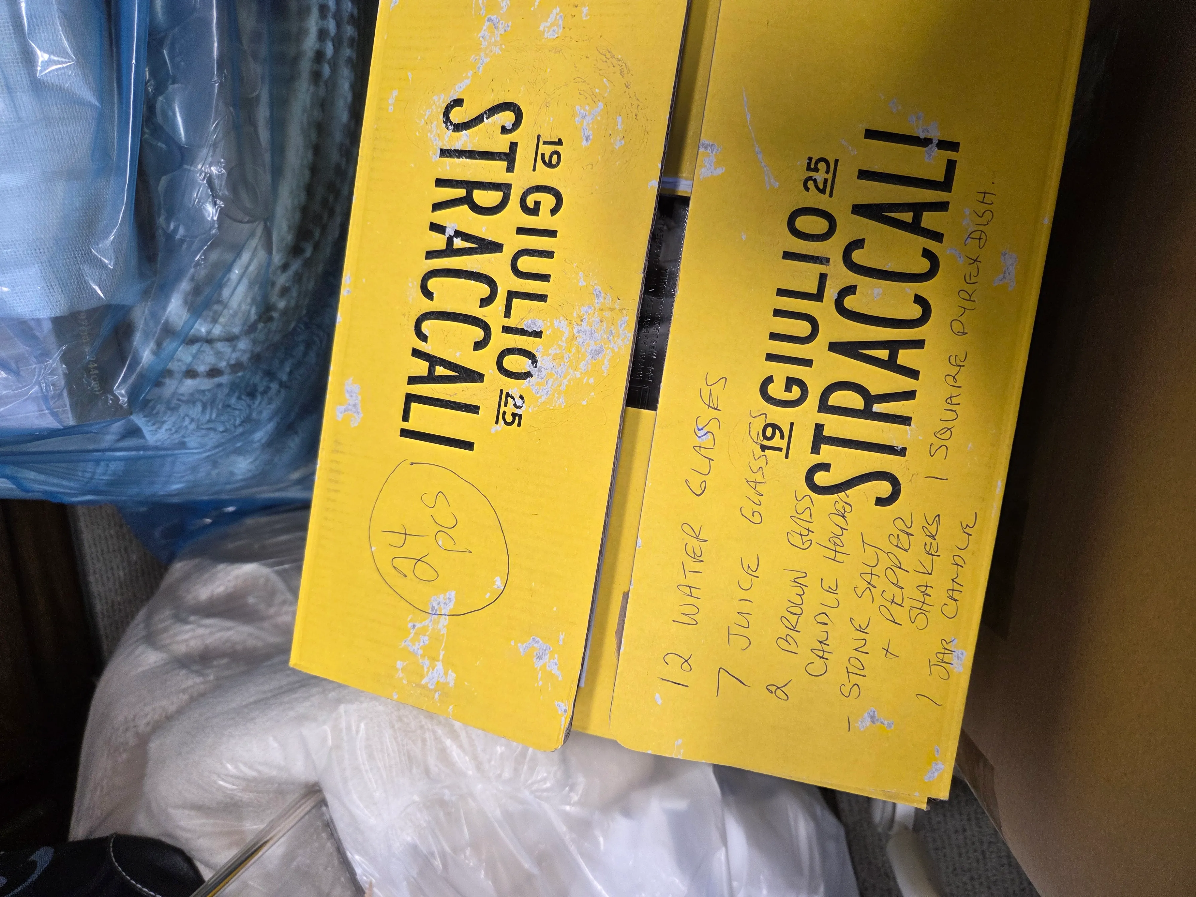 Will unpack someday. My mom did put a nice list on the top of the box as a preview. So many more boxes to unpackkkkkkkk. Maybe I need a labor trade / helper to come get me organization in here ! Ah! 12 water glasses, 7 juice glasses, 2 brown glass candle holders, stone salt and pepper shakers, 1 jar candle and the square pyrex modern dish. will take more pics if anyone is interested in the listed items :D