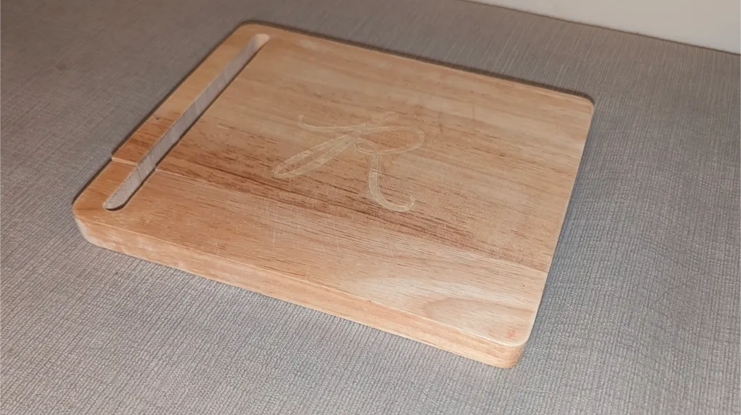 Great charcuterie board with the letter "R". There is a small crack in the wood as shown in photos, but overall in great functional condition.