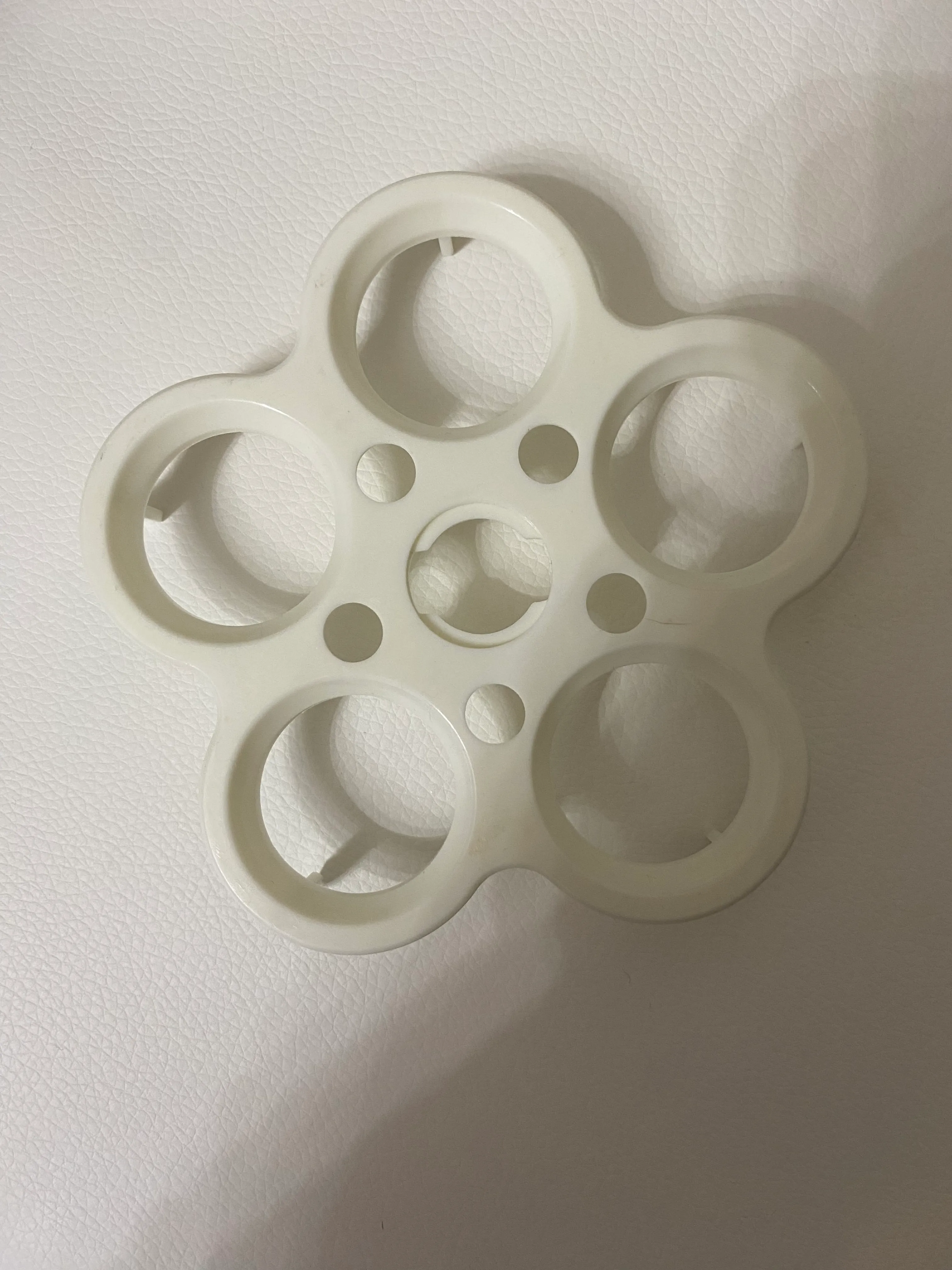 A white plastic egg holder with 6 spaces for eggs. It is shaped like a flower.