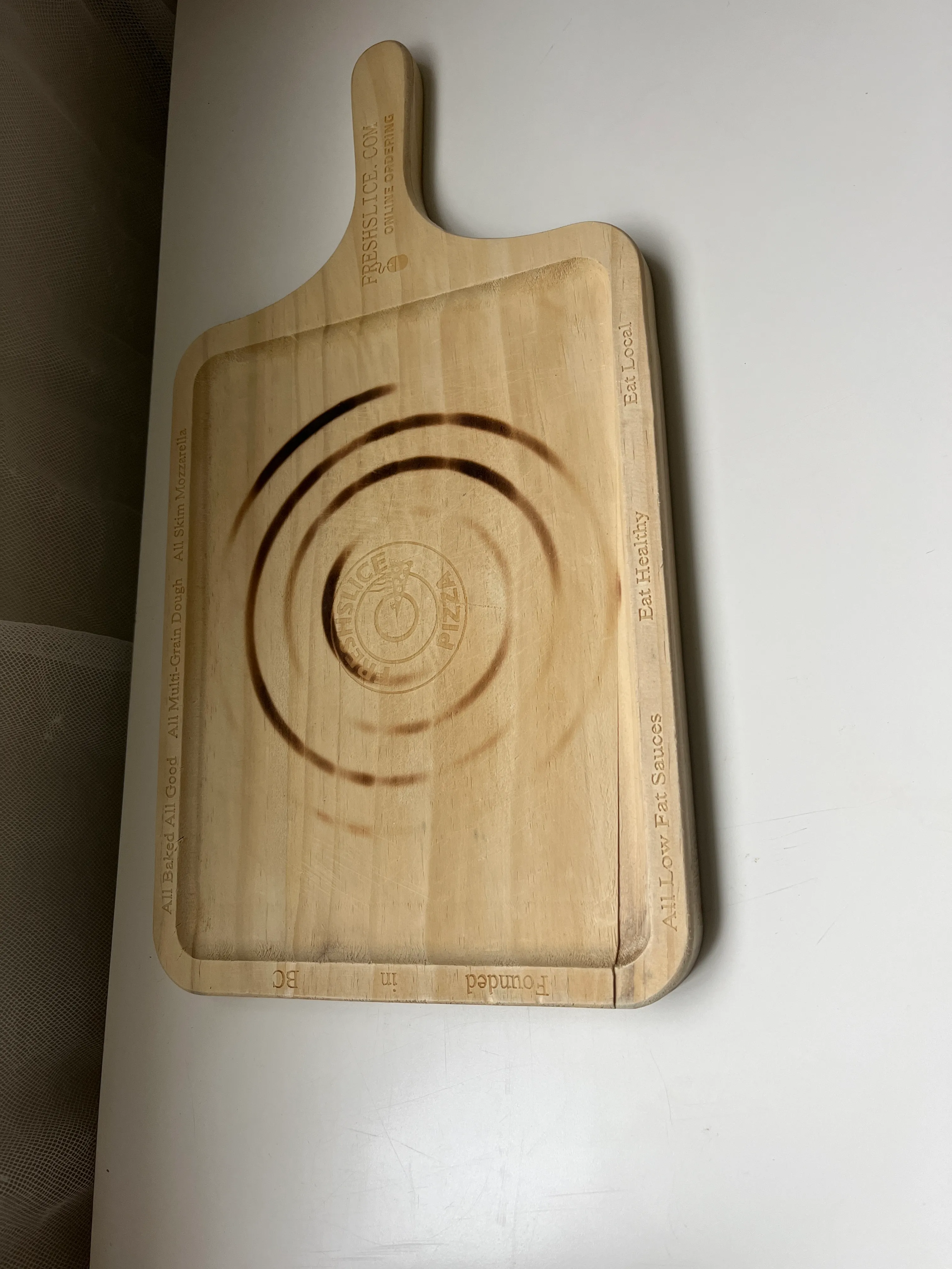 Pizza holder or cutting board with some round burnt marks on it.