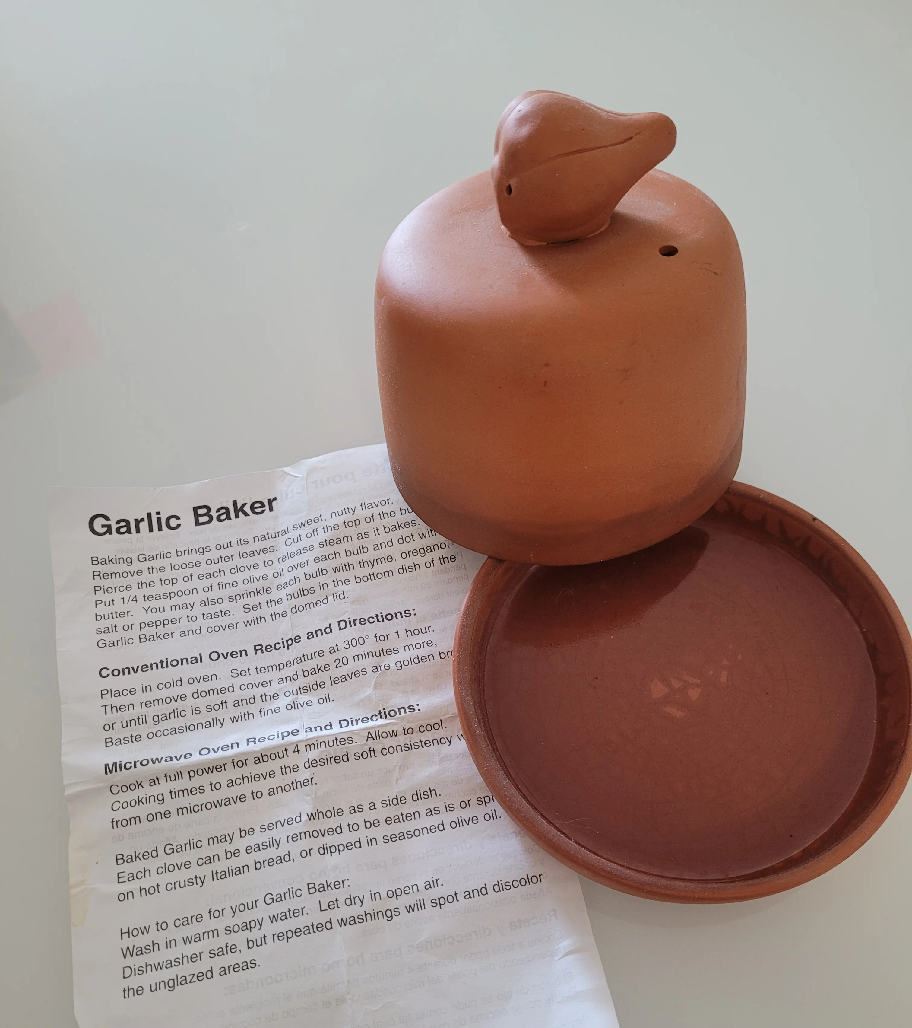Cute garlic baker with instruction manual Some olive oil stains but fully functional Terracotta material