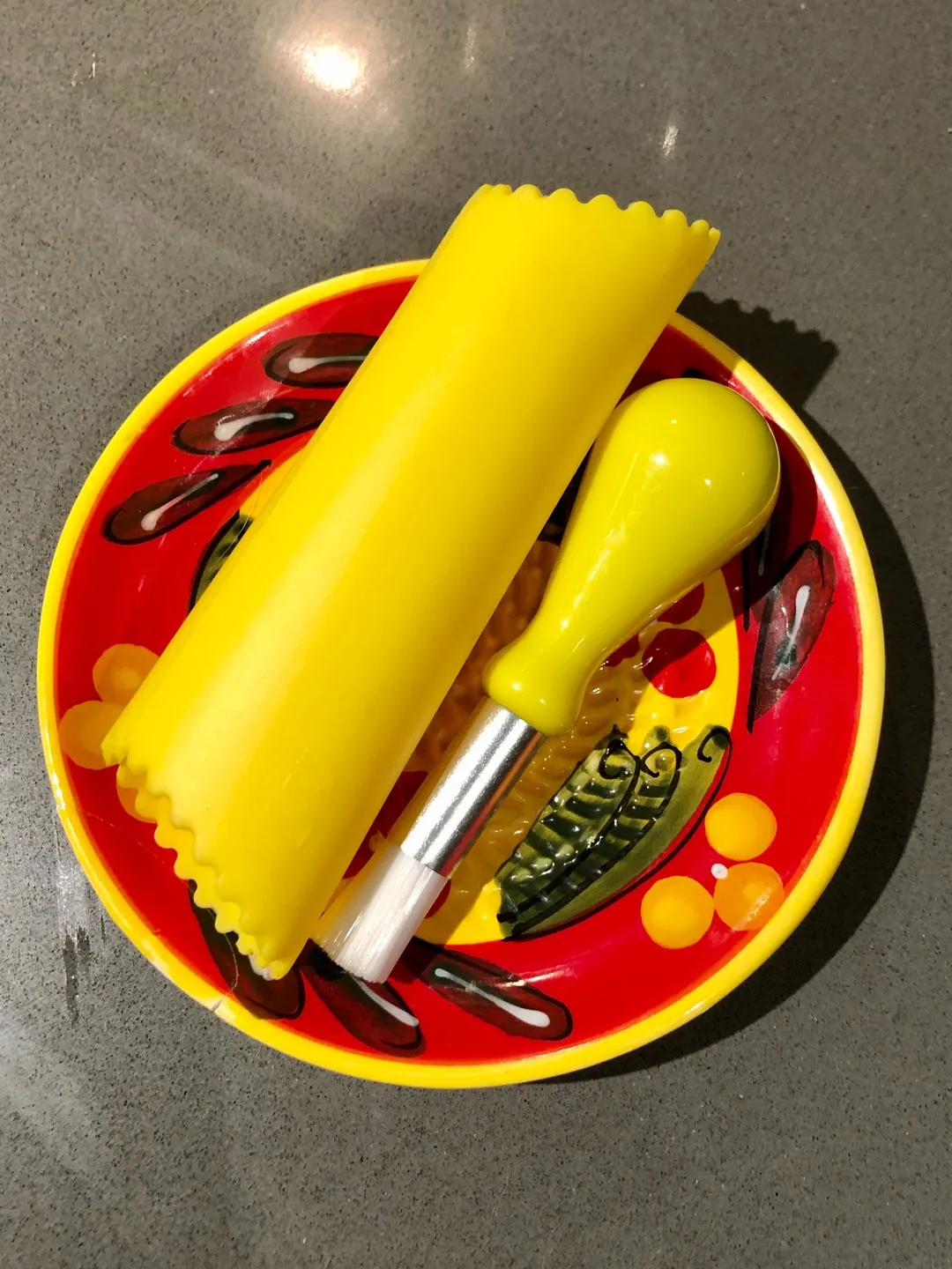 Peel and crush your garlic with this colourful little kit. Received it as a gift but I have a garlic press. It comes with a silicone roller which assists in removing the thin skin on garlic cloves, a decorative plate with a textured surface (this crushes your garlic when you rub the clove against it, and a little brush to scrape the garlic from the plate to your cooking.