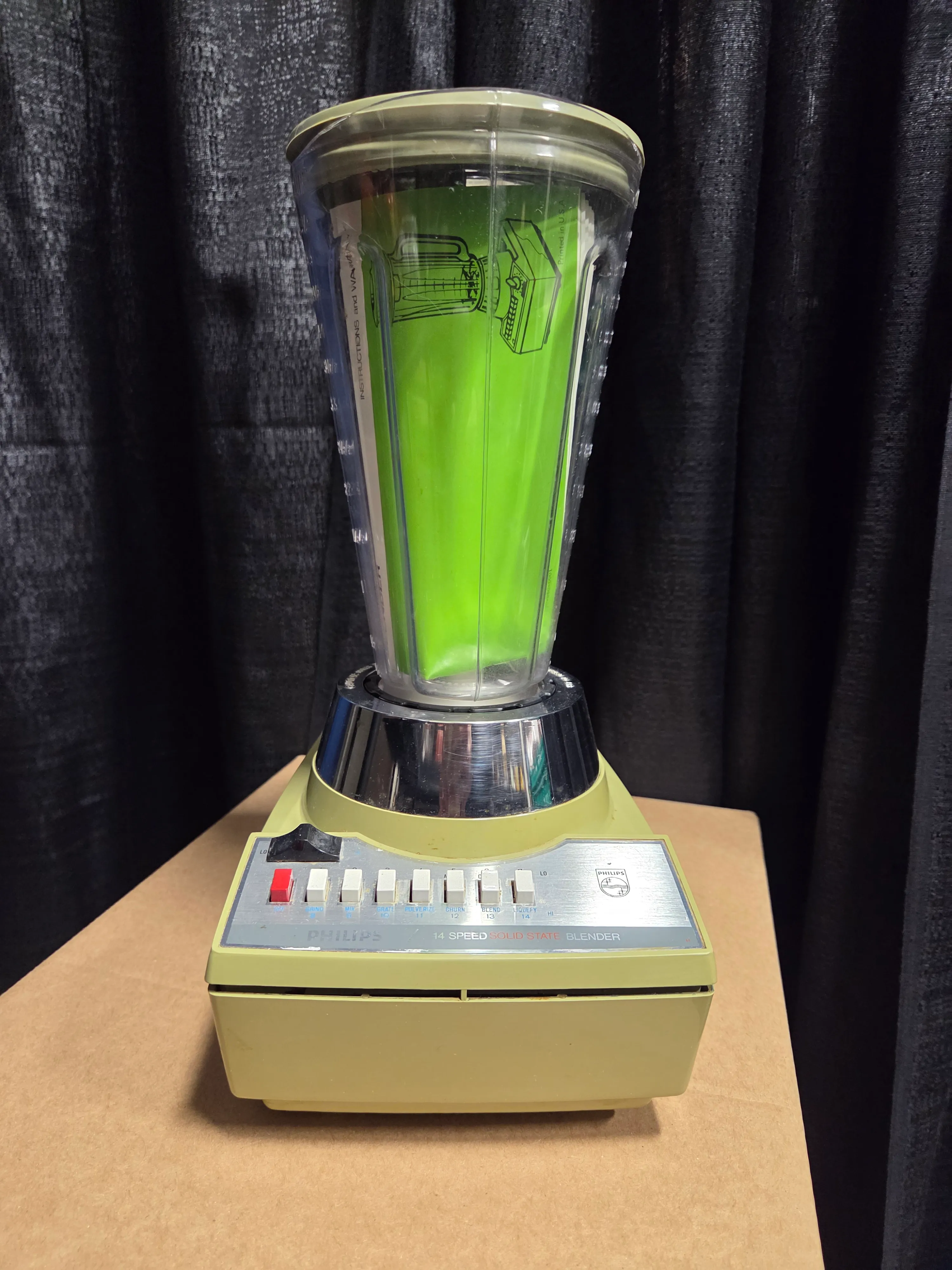 Older colour green blender. Has the base the container with liquid measure markings built in, plus the lid and original instructions booklet.