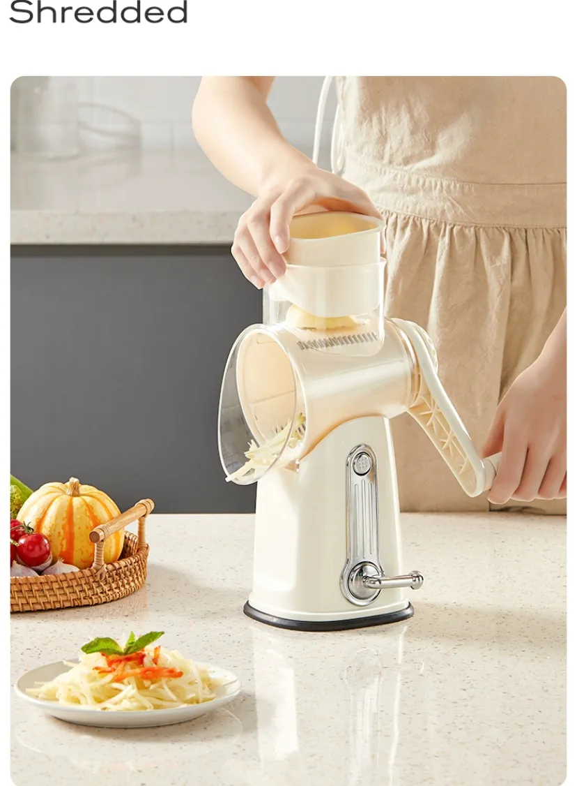 Manual food slicer for vegetables and fruits. It comes with different blades for slicing, grating, and shredding. The slicer is made of durable plastic with a stainless steel blade. It is easy to use and clean.