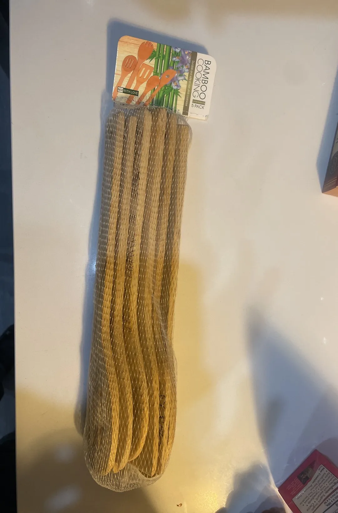 Set of 6 bamboo cooking utensils Engraved with flowers and cute messages Unopened package 3 spatulas (2 slotted) 2 spoons (1 slotted) 1 pronged utensil 🍴