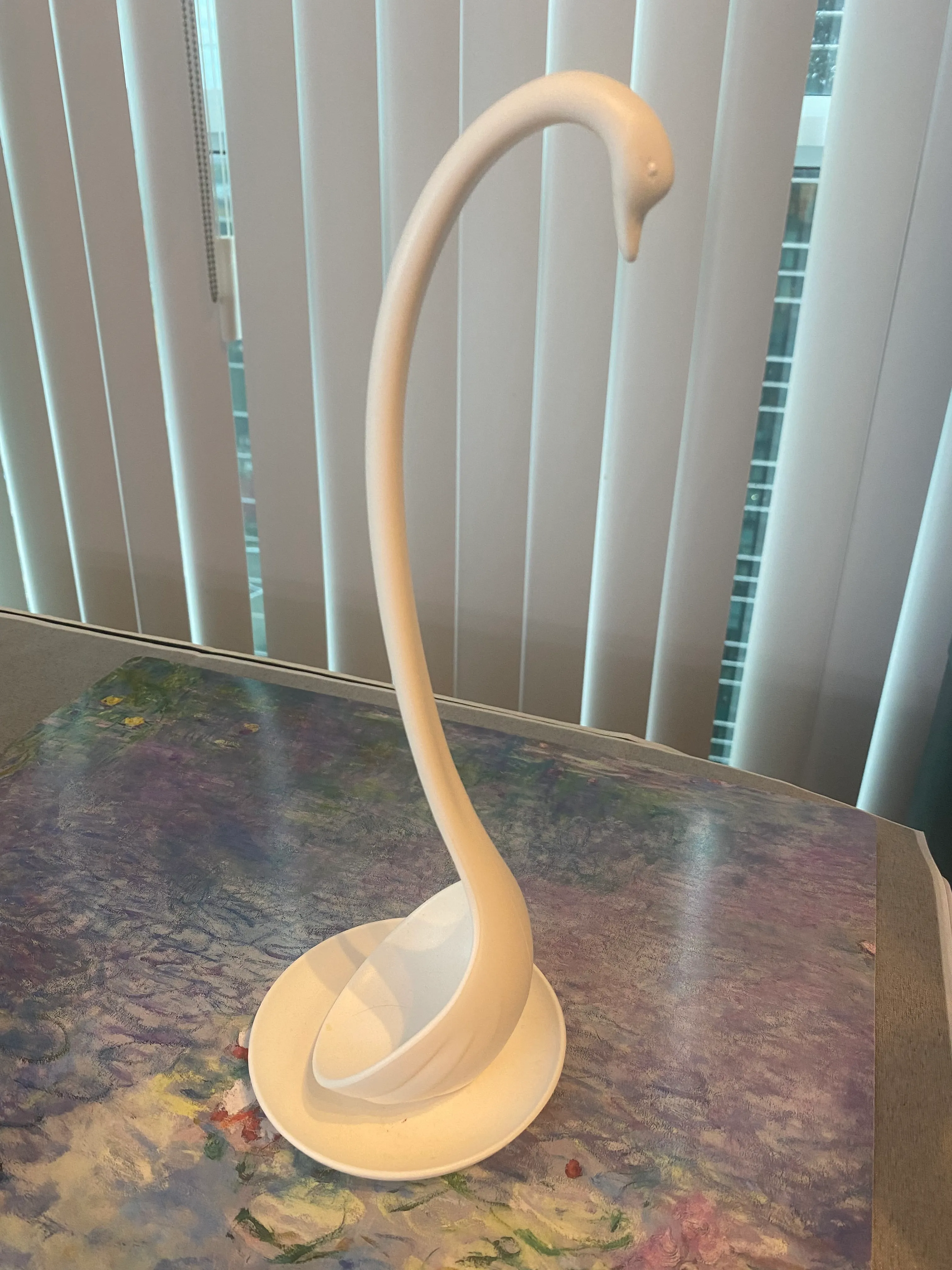 This is a unique swan ladle with a stand. It's perfect for adding a touch of elegance to your kitchen. The ladle is white and in great condition. It's a fun and functional addition to any home.