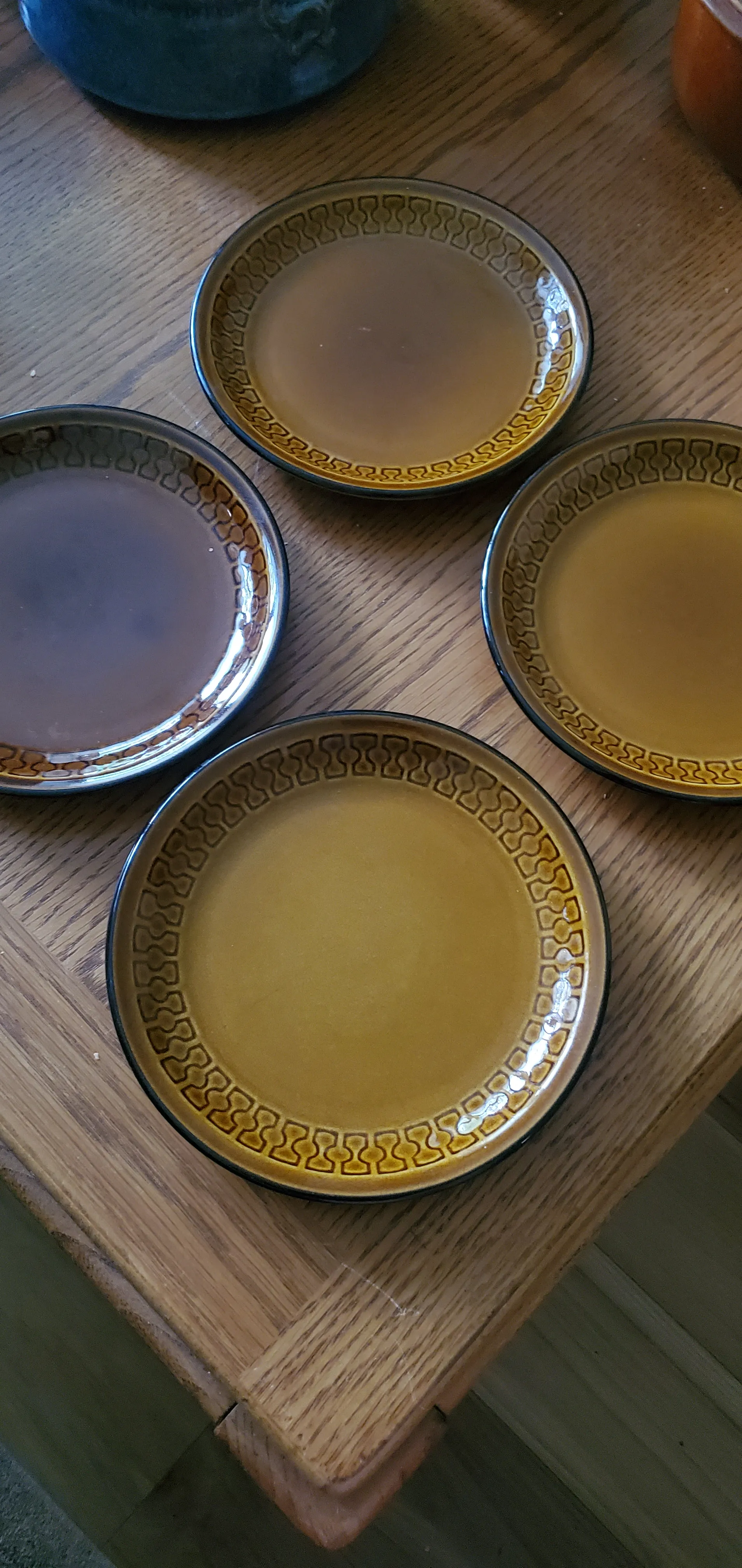 Set of 4 vintage side plates. Colour variation in 1 plate. 1 plate has a small scratch in the glaze, not deep enough to reach the clay - see last photo