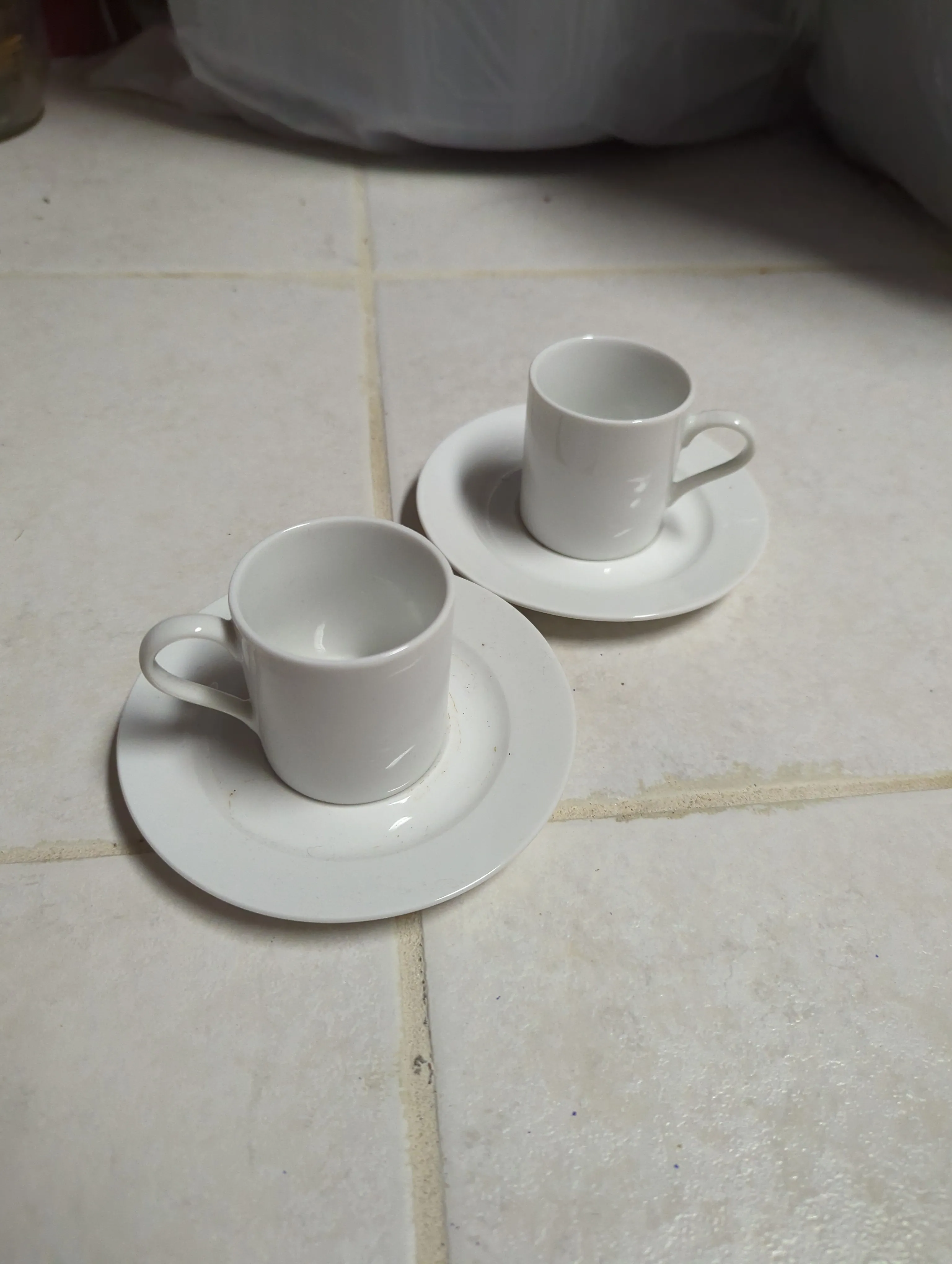 Set of white espresso cups with matching white saucers. Perfect for a quiet morning moment, enjoying your favourite coffee.