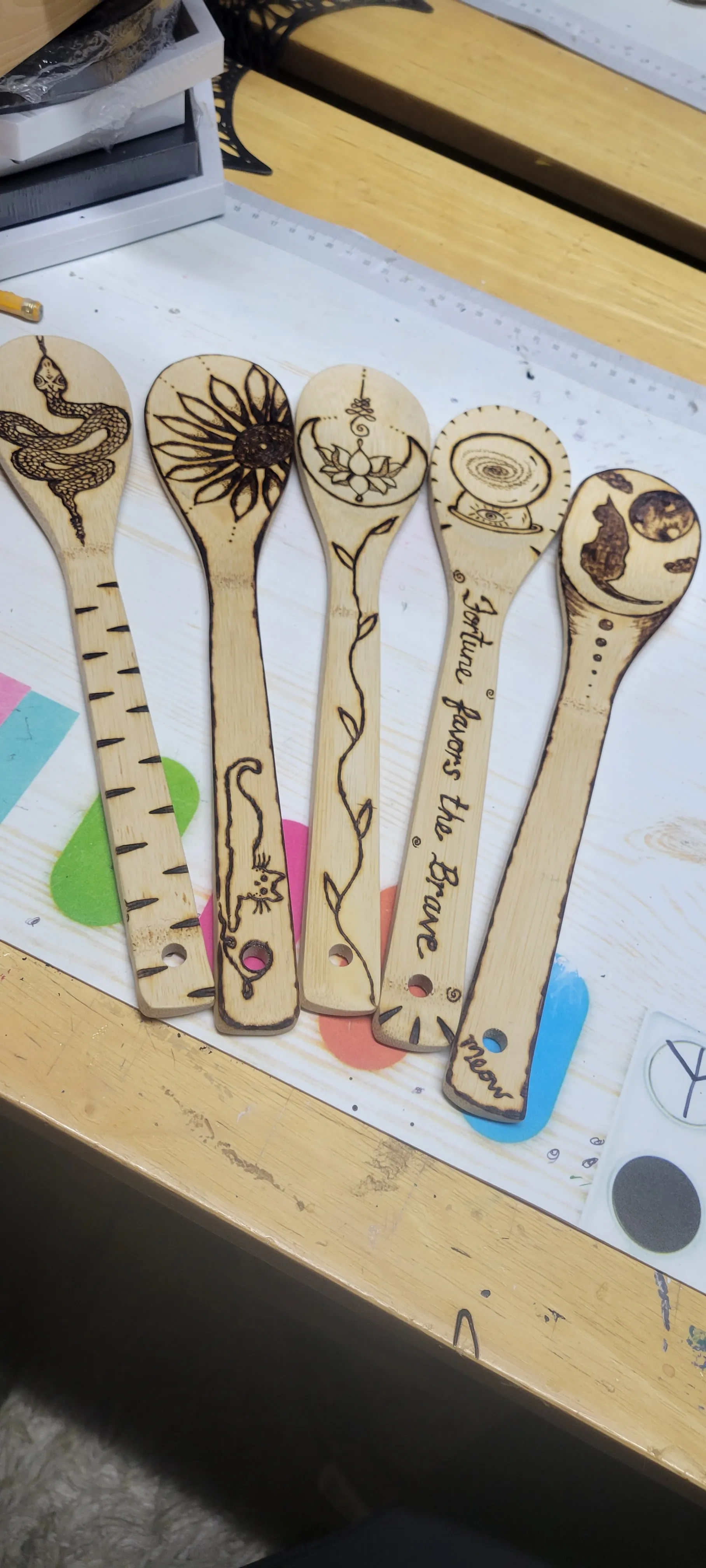 Im learning pyrography and have these available to trade or sell st my upcoming markets. Cottagecore and witchy themes. Fully functional bamboo spoons, can also be used as decorative altar pieces. I'll be selling them for $24 each at markets this Spring. Open to custom ideas