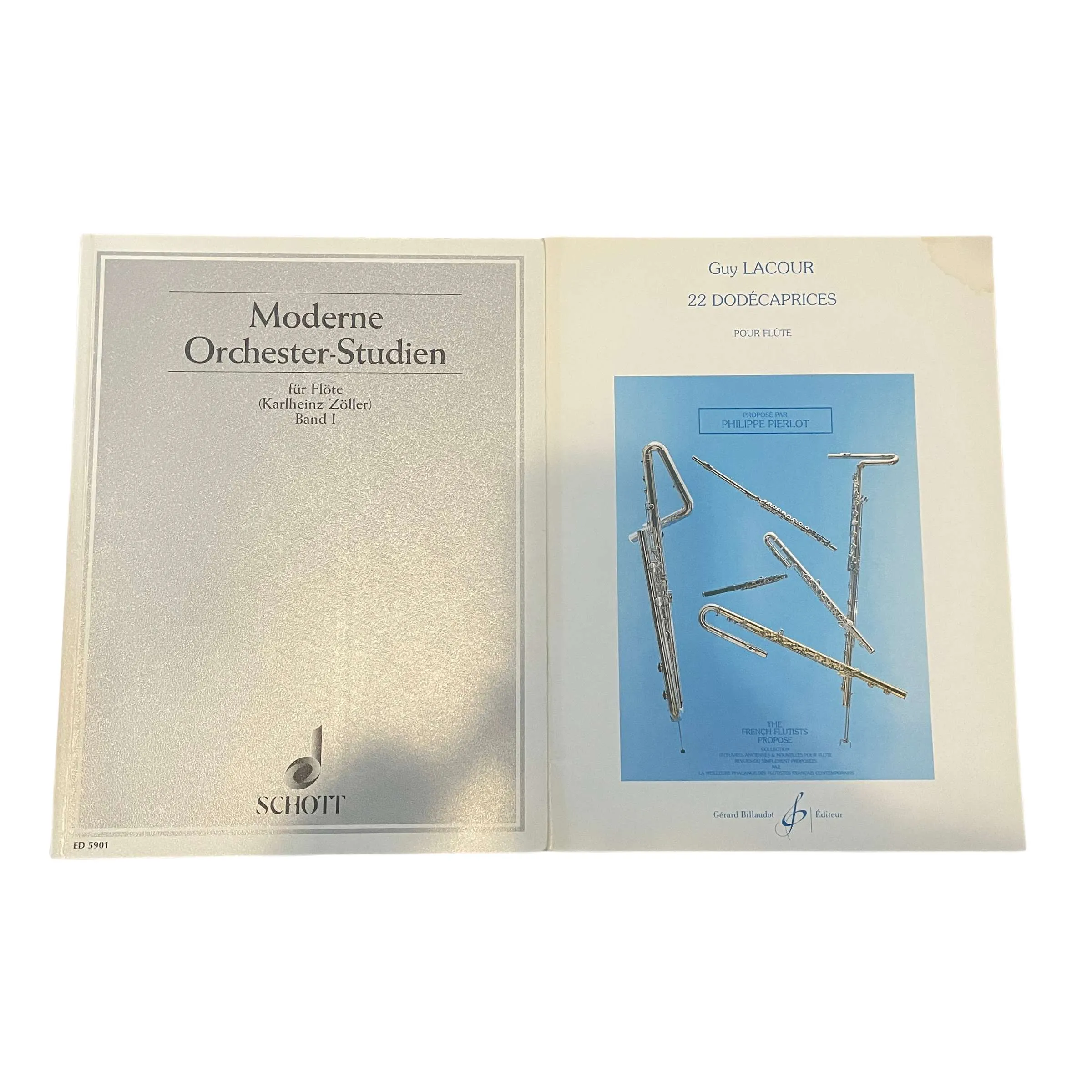 Please see the list below for exact titles & values: Orchestral Studies for the Flute III $19 Moderne Orchester-Studien $11 BACH Hamburger Sonate G major $9 CZERNY-GERMER Select Piano Studies Vol I $4 ENDRESEN Supplementary Studies $4 HANDEL 10 Sonatas Vol II $8 IBERT Aria for flute and piano $13 LACOUR 22 Dodecaprices pour flute $9 RUBANK Supplementary Studies for Flute or Piccolo TELE MANN Sonata in F major $12