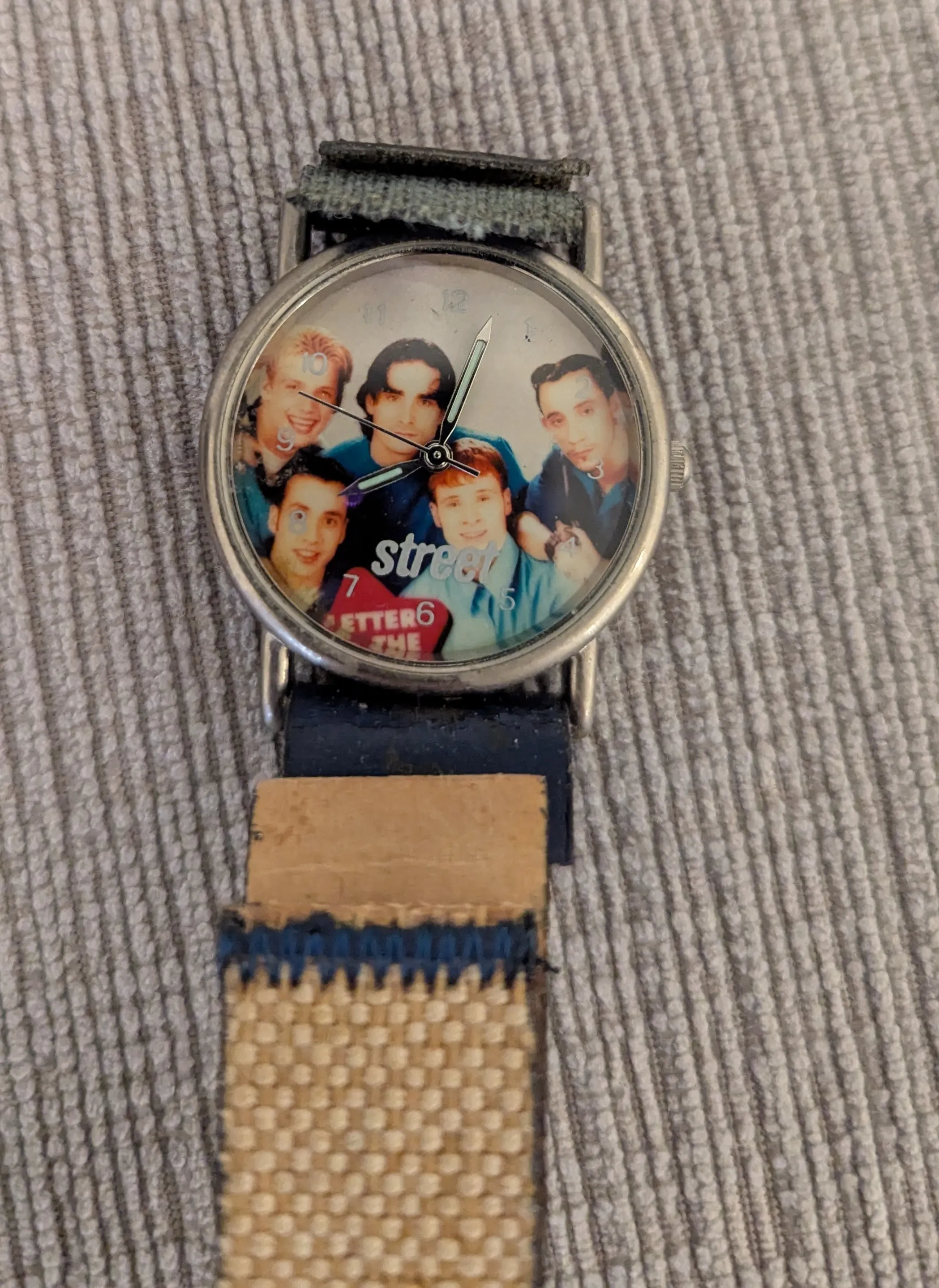 Pre-owned Street Boys band watch. Features a picture of the band on the face. Beige fabric band with dark blue accents. Silver coloured casing.
