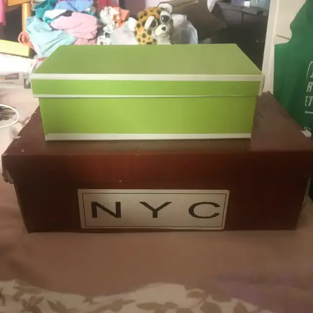 Shoe box (normal sized ones) and smaller box (big ones) with paper clips Trombones dans une boîte à souliers (de taille normale) et boîte « plus petite » (plus grandes)