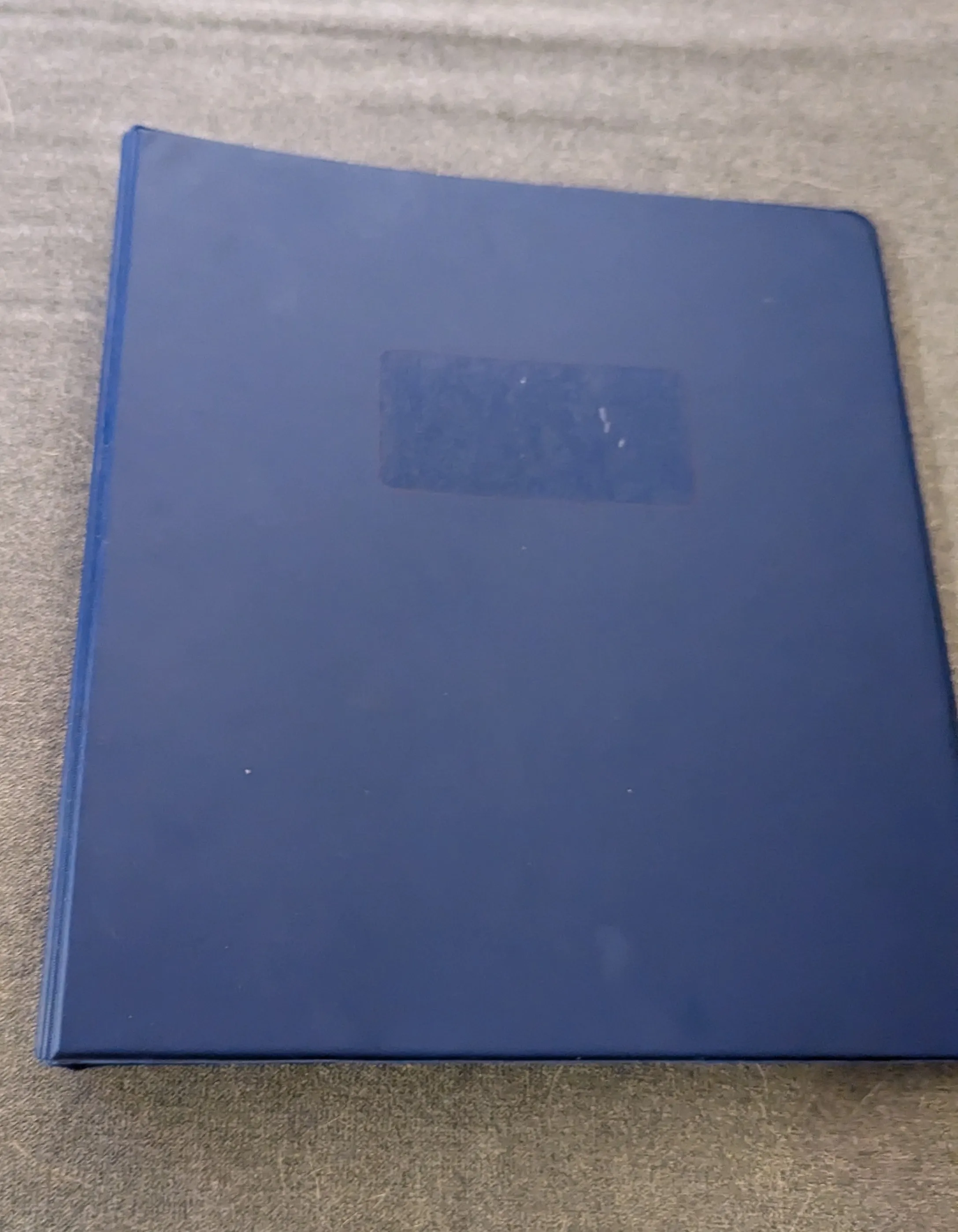 Durable three-ring binder. Blue cover. Good for organizing papers. Includes lined paper.