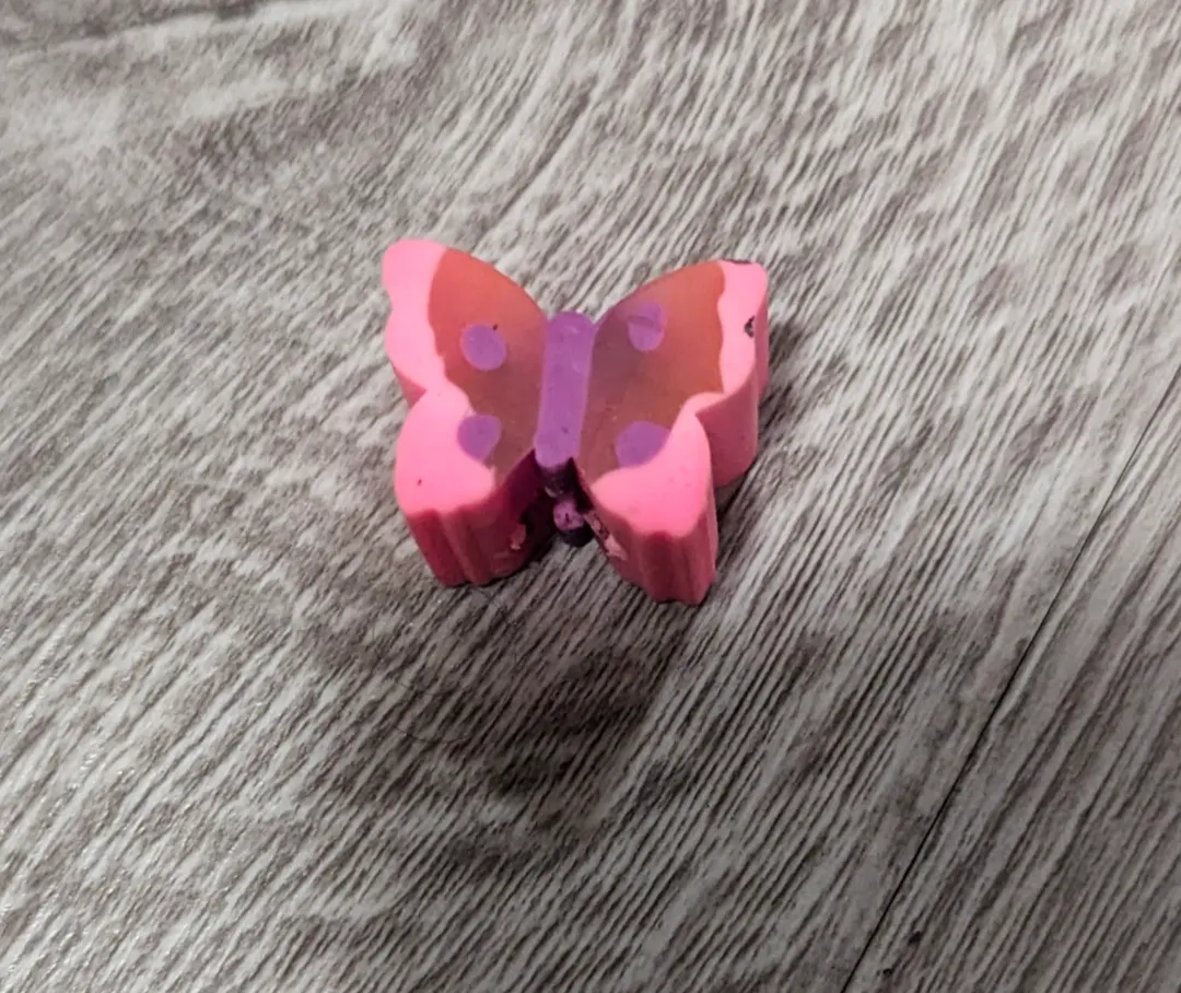 A colorful butterfly eraser. It features pink and red wings. A great addition to your stationary collection for peaceful studying.