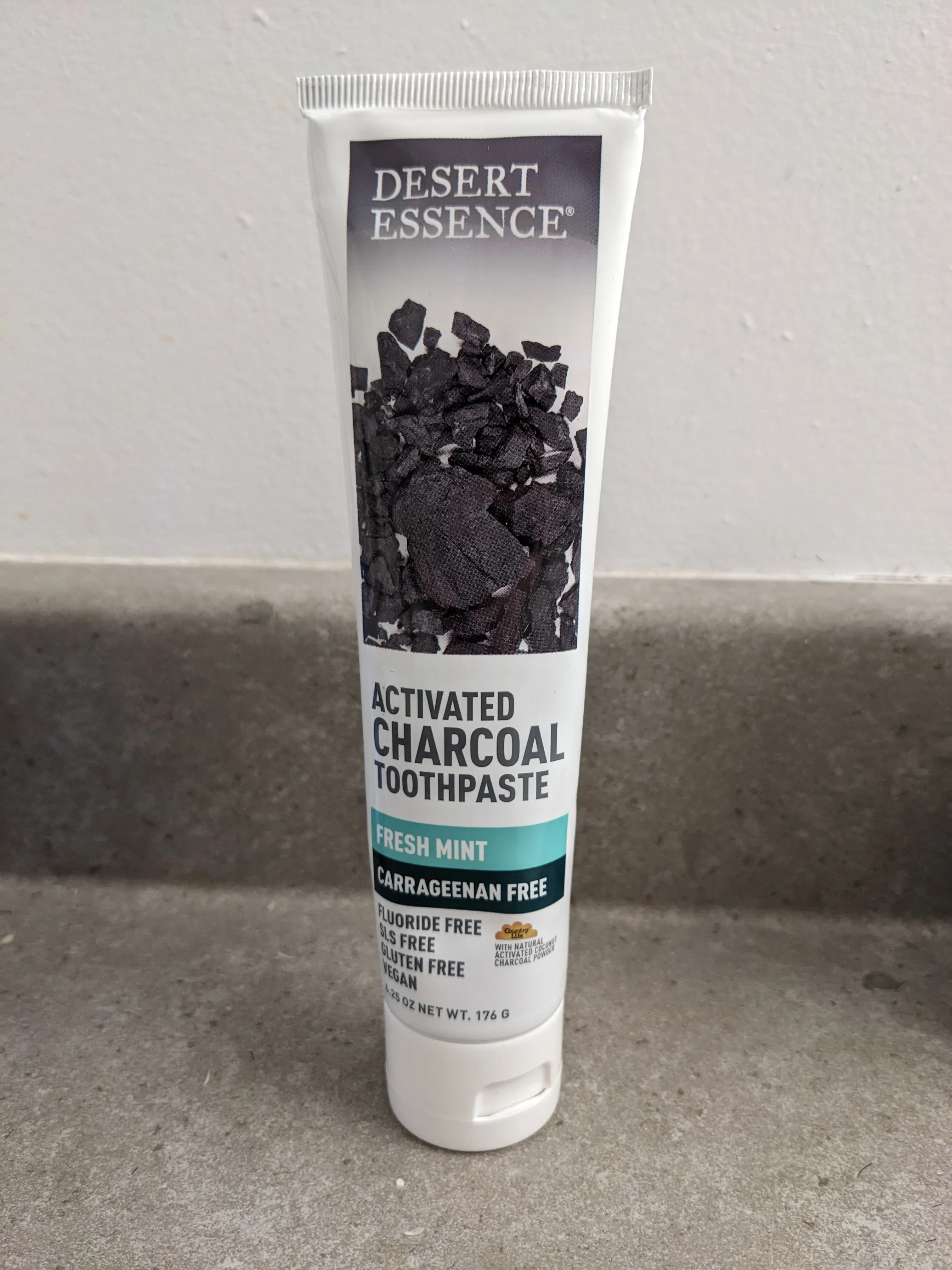 Activated natural charcoal toothpaste, Fluoride free, SLS free, carrageenan free, gluten free, vegan friendly. Tried a drop, wasn't my taste!