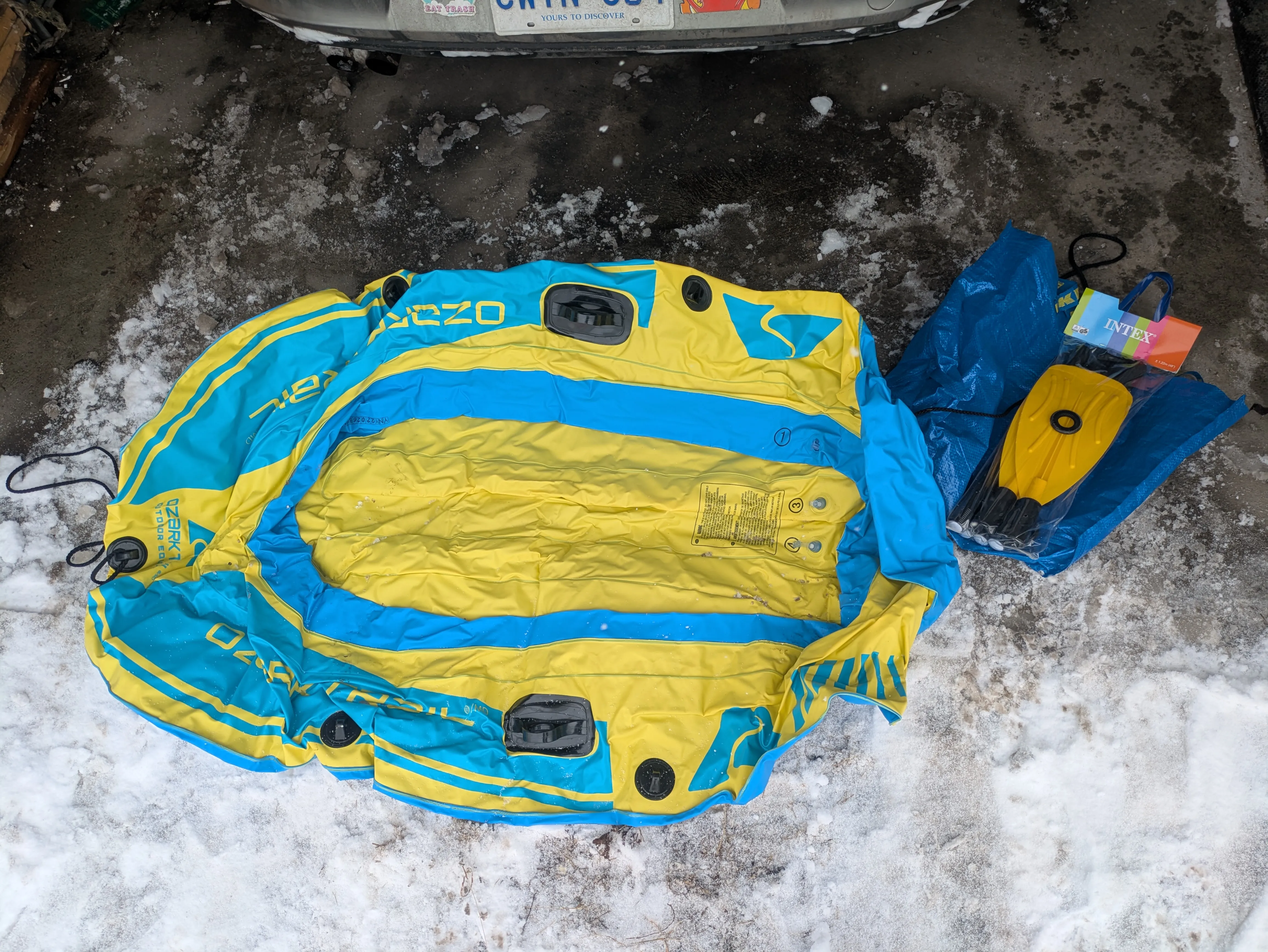 Inflatable and comes with brand new oars. I took it out once and then someone bought me a paddleboard. Things pretty much brand new.
