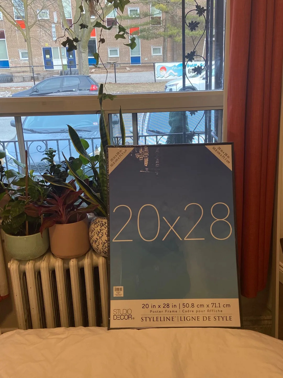 Never opened, purchased from Michael’s pre shutdown. Thin, minimalist black matte frame Fits a standard poster but my art wasn’t standard size