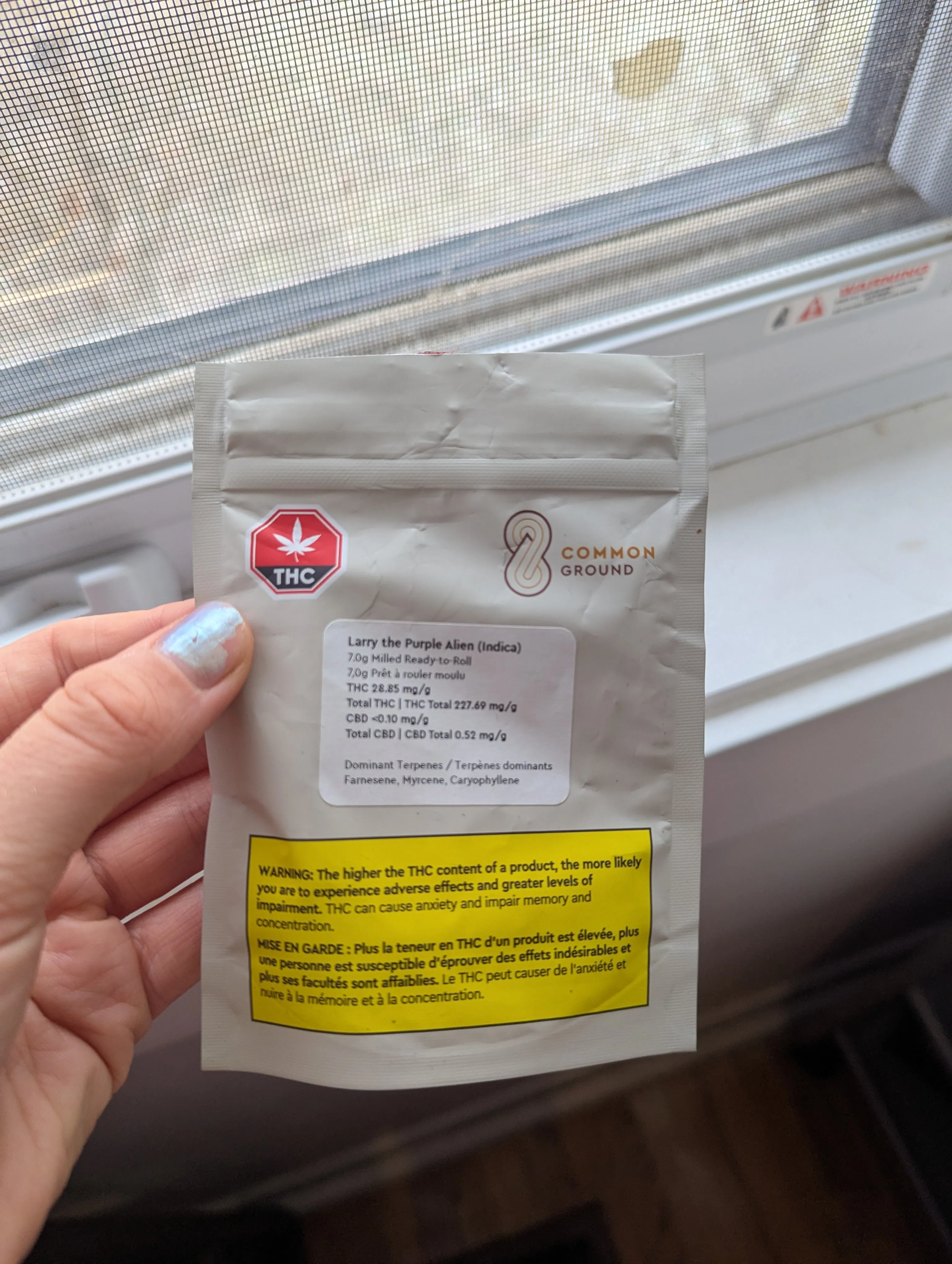 Strain is Larry the Purple Alien. Package was open and some was used. Weight of whole container incl. the bag is 10g.